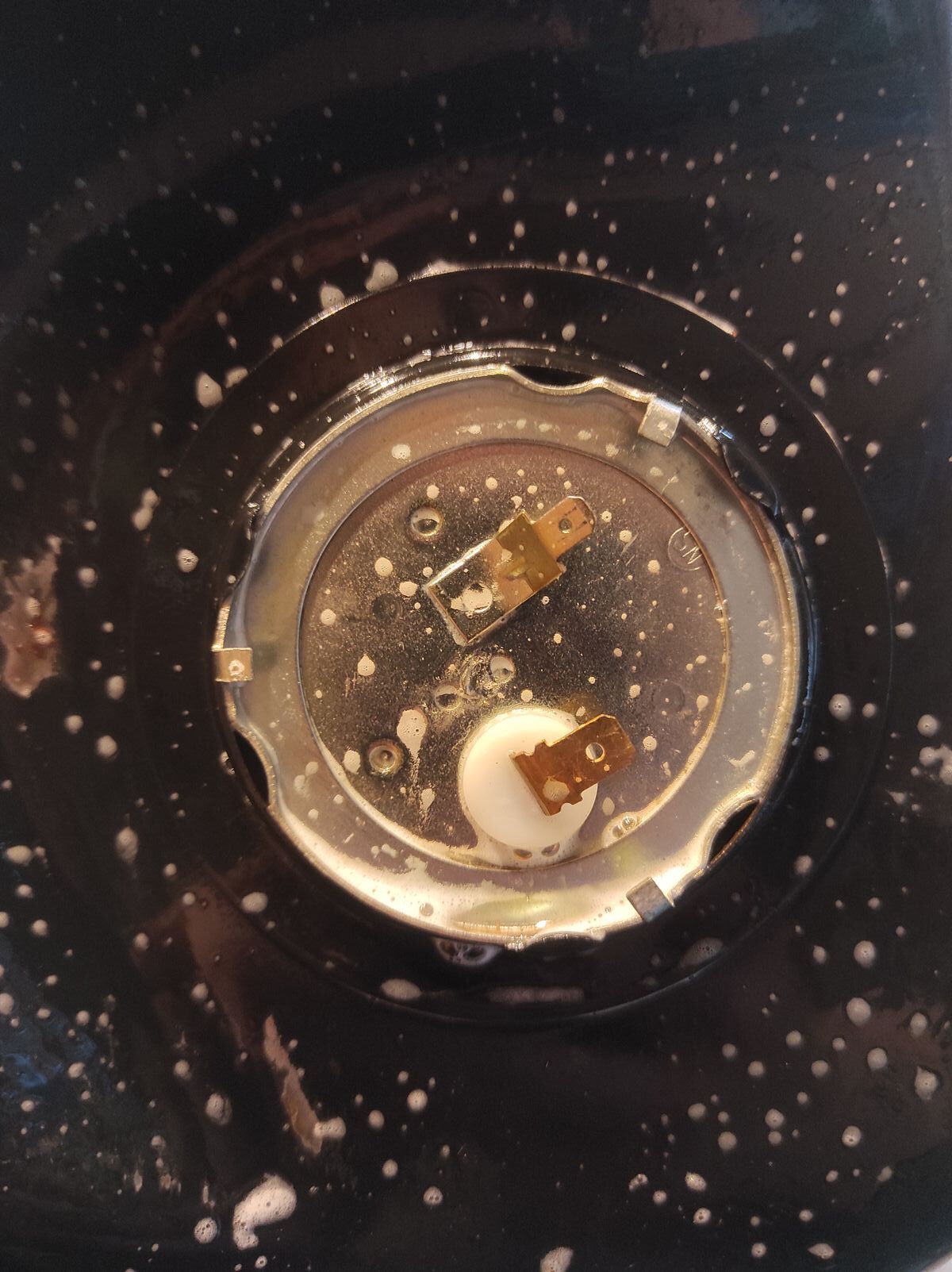 Theorie: Bei Rechtskurven unter Vollgas schwappt die Plörre raus und läuft dann hinter die Gummidichtung in den Schaumstoff. Der sorgt dann für langanhaltende Freude.