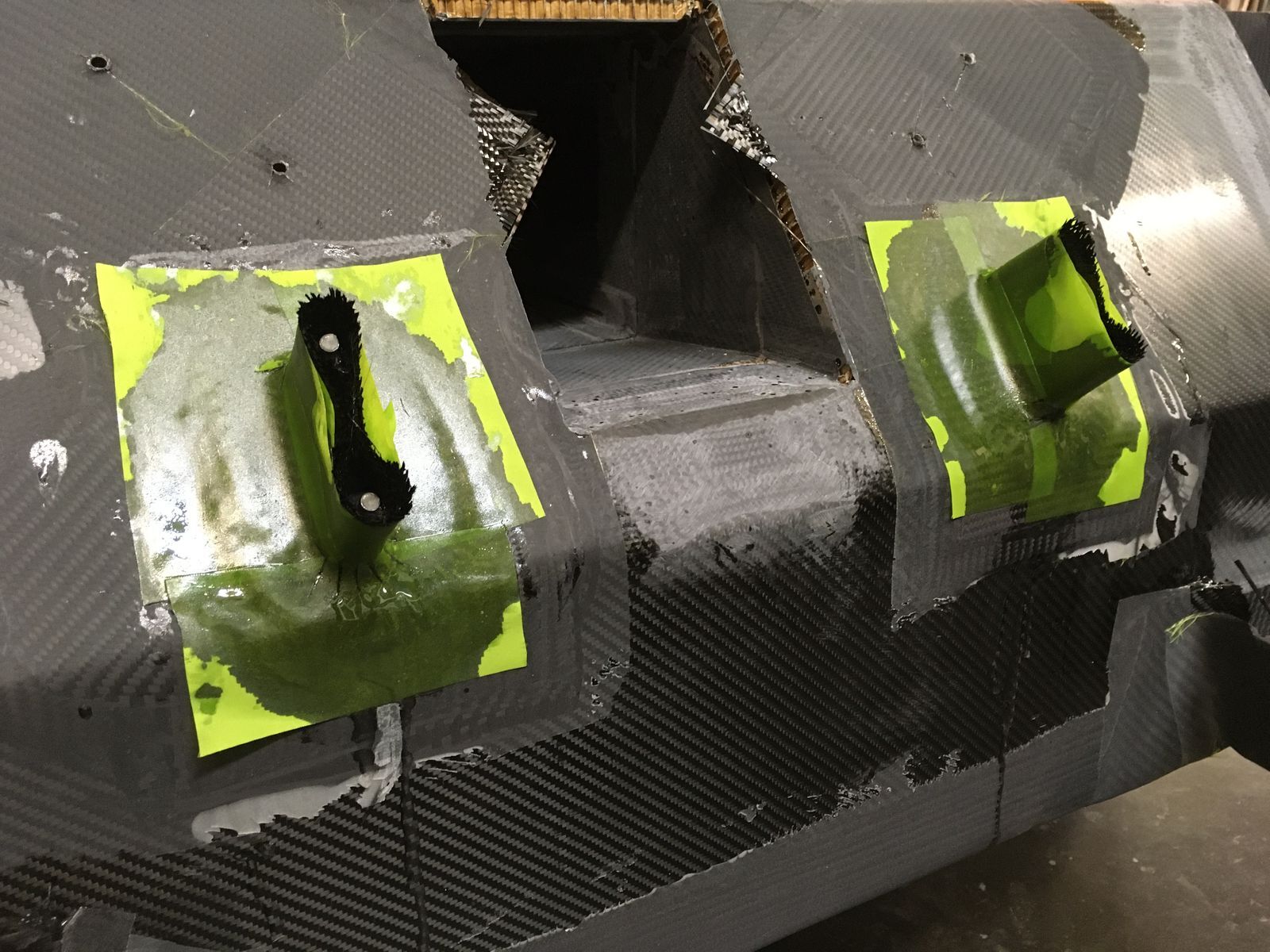 Alles überlaminiert und mit Abreißgewebe belegt. Die eigentlichen Lagerböcke werden dann erst in einem weiteren Arbeitsgang kraftschlüssig mit dem Chassis verbunden.