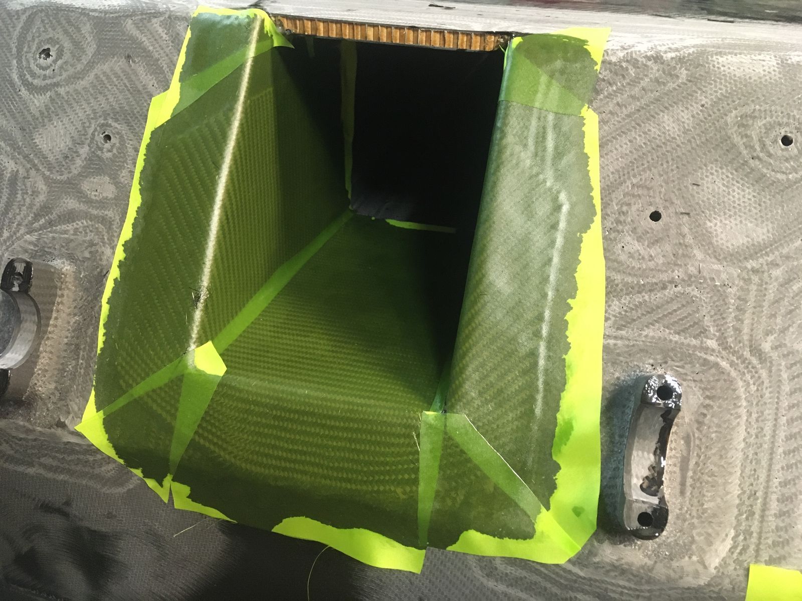 Fertig laminiert und mit Abreißgewebe belegt. Wenn alles ausgehärtet ist, kommt das Abreißgewebe wieder herunter, die Fläche wird sauber eingeschiffen, die Aussparung und die Gewinde wieder freigelegt und fertig ist die Aufnahme für den Handbremshebel.