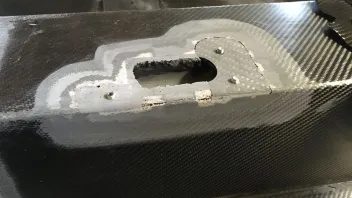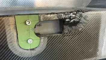 Fertig laminiert und mit Abreißgewebe belegt. Wenn alles ausgehärtet ist, kommt das Abreißgewebe wieder herunter, die Fläche wird sauber eingeschiffen, die Aussparung und die Gewinde wieder freigelegt und fertig ist die Aufnahme für den Handbremshebel.