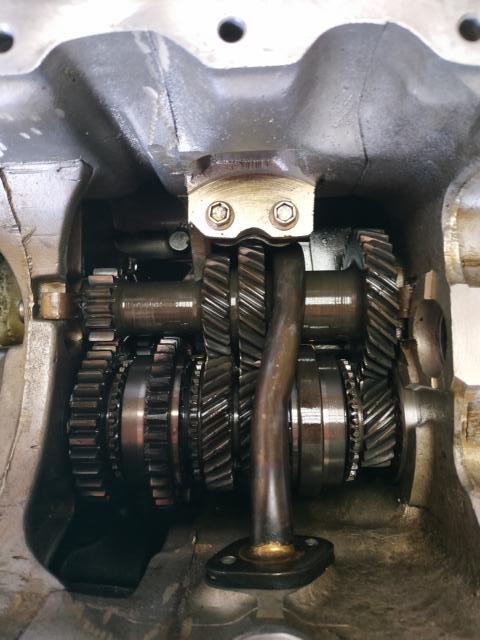 Ich kann hinsichtlich Schaltgabeln nicht viel erkennen, und da sich an der Hauptwelle? nichts bewegen läßt habe ich mal ein Foto gemacht.