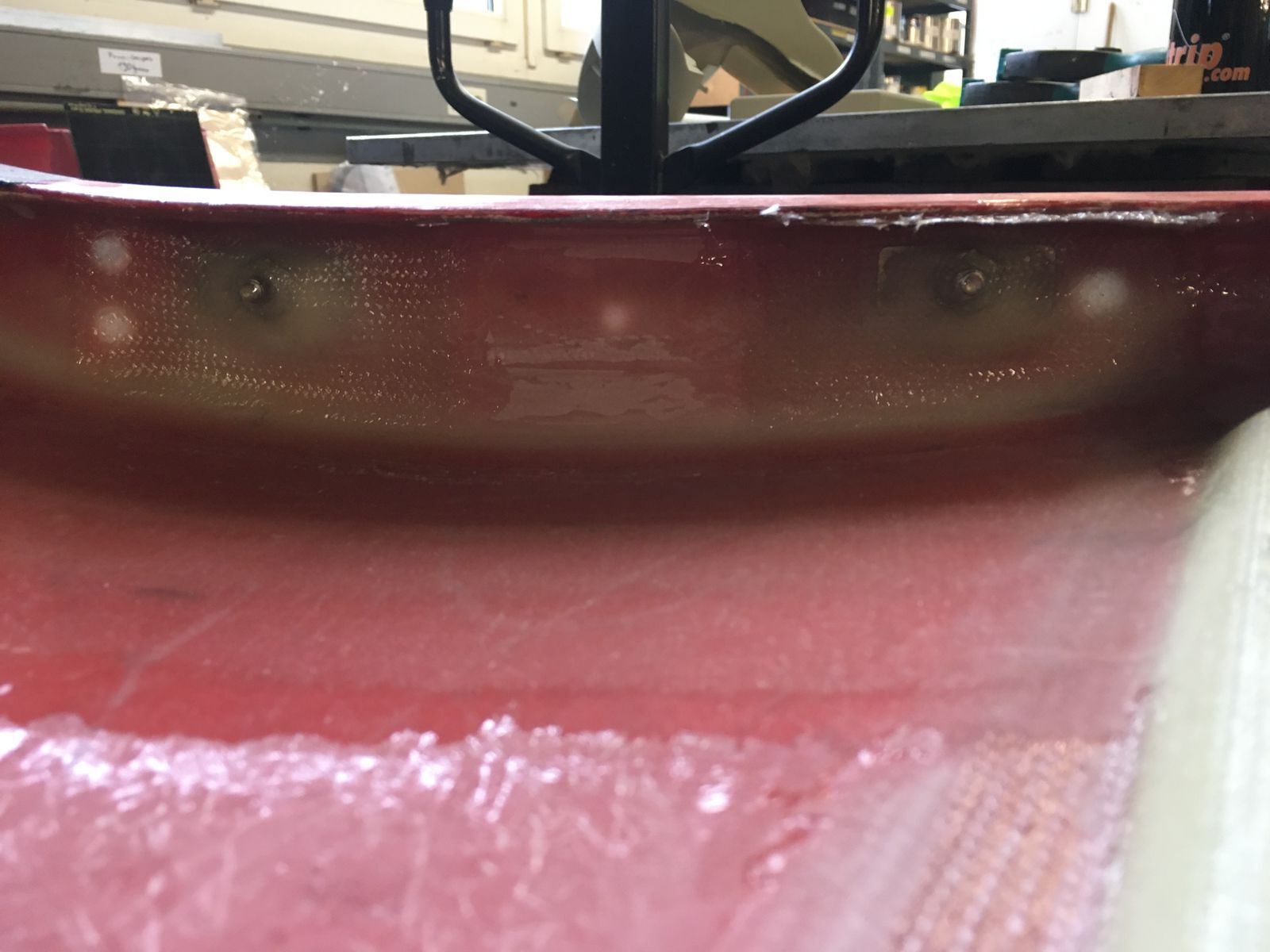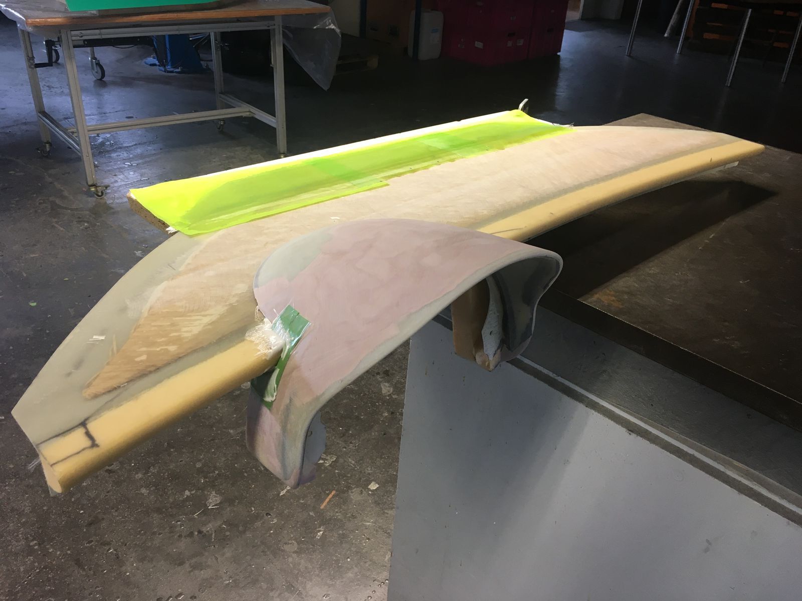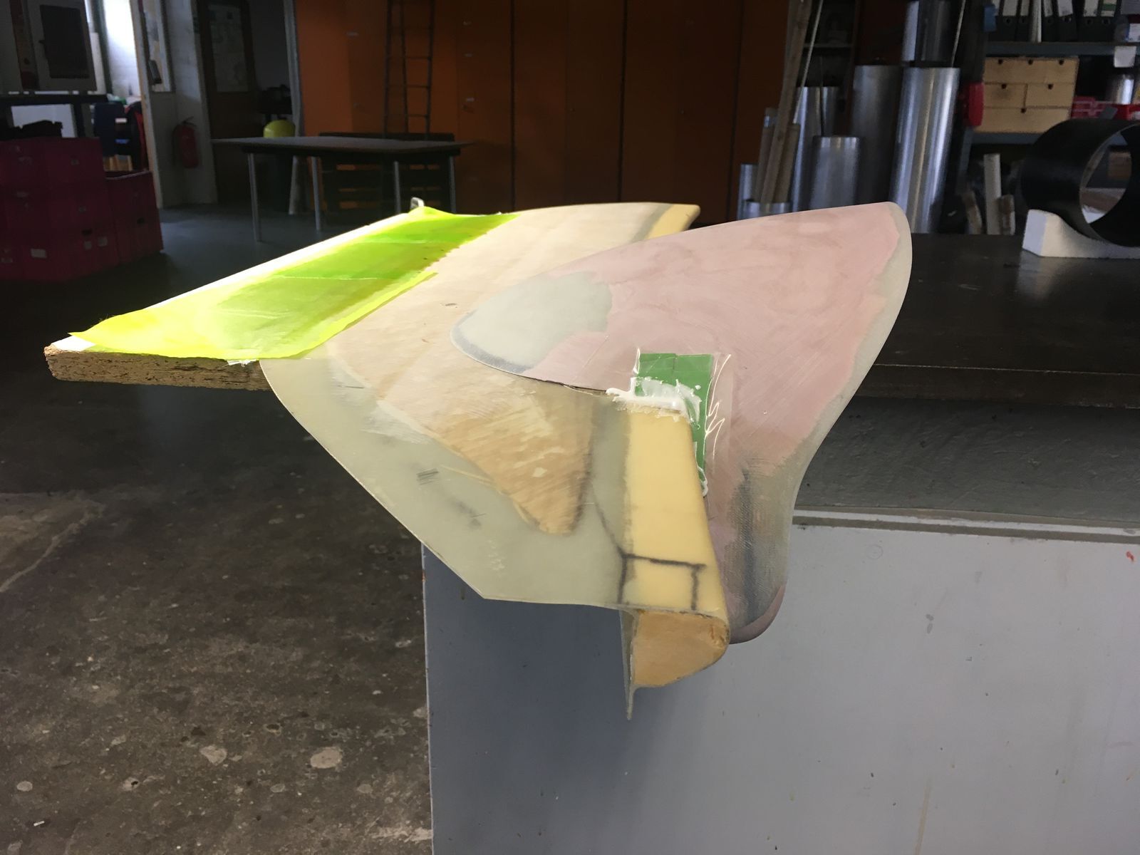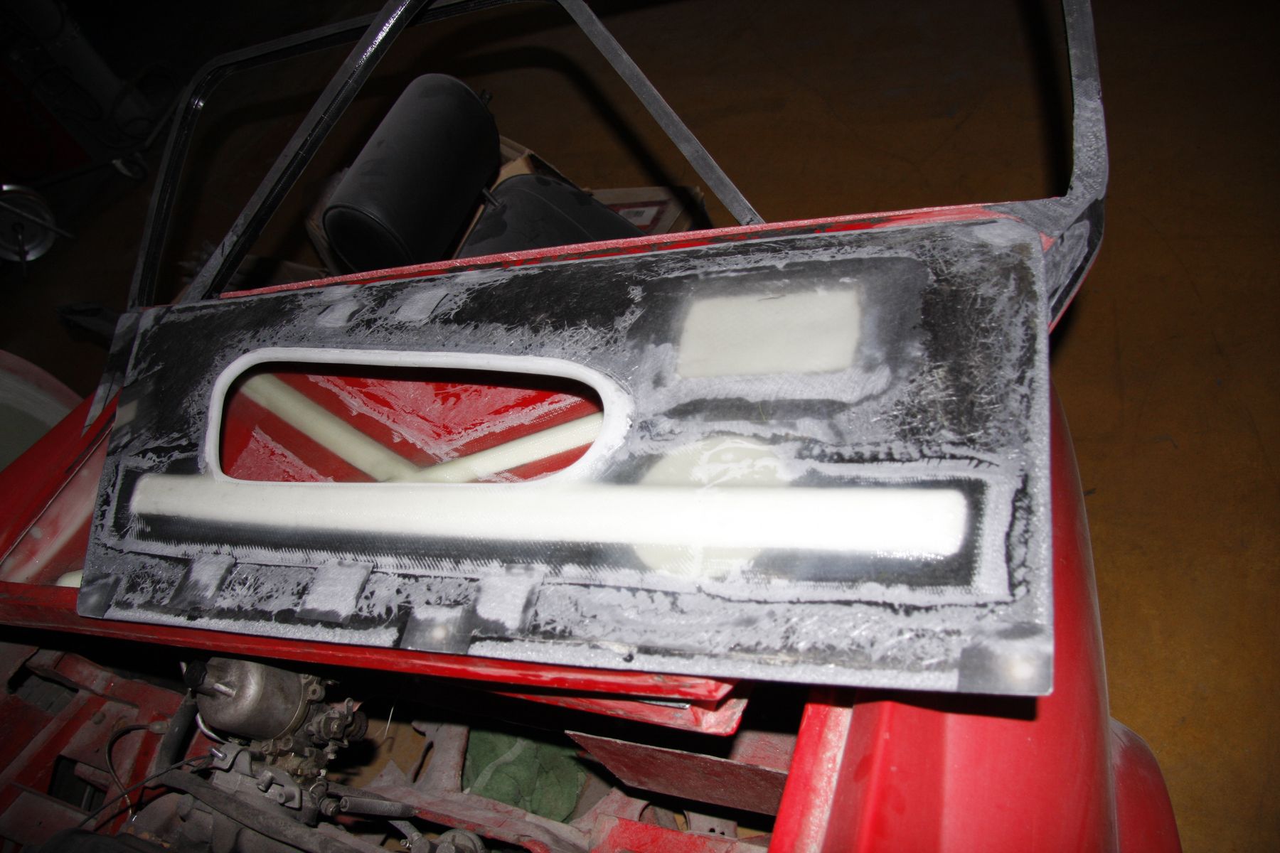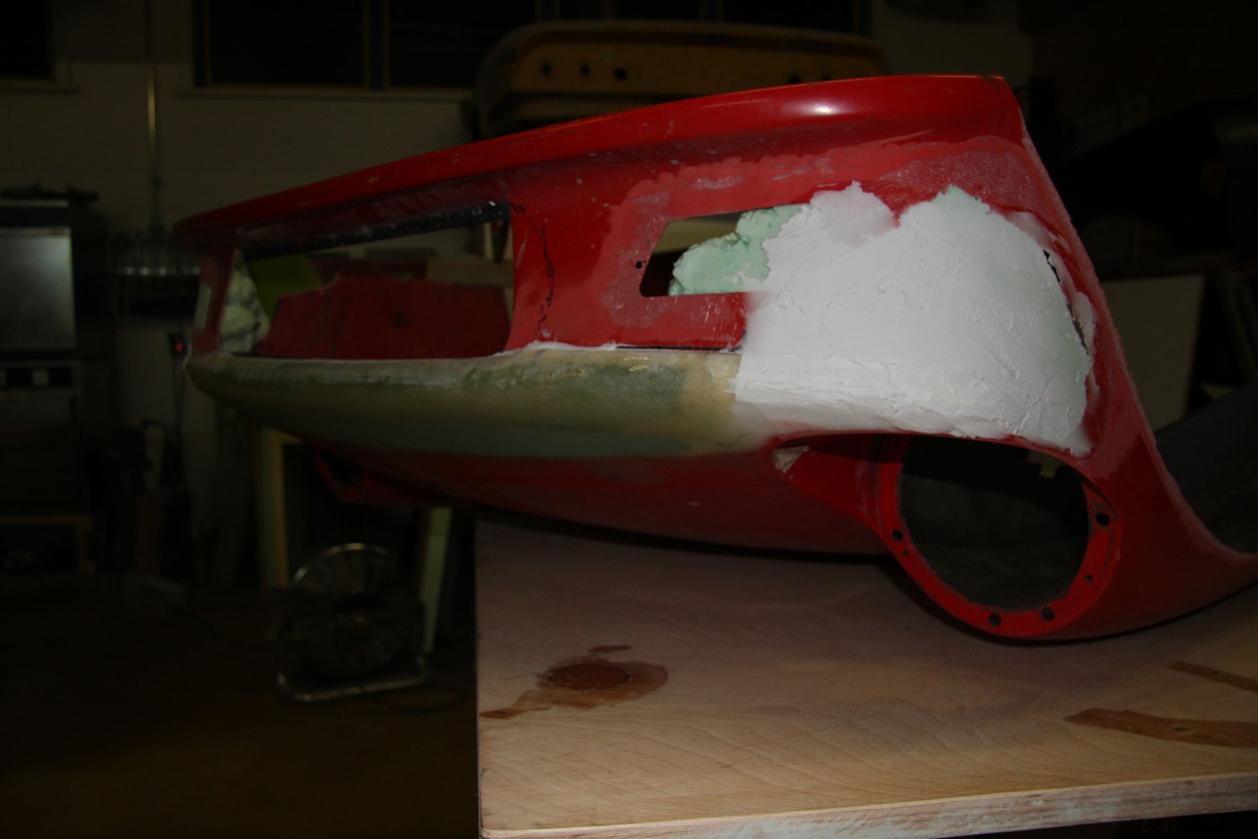 Was mich aber deutlich gestört hatte war der "spannungsarme" flache Bereich zwischen den Kotflügeln. Abhilfe schafft ein Schnitt in der Mitte und kurz vor dem vorderen Abschluß gesetzt, das GfK etwas aufgespreizt, fixiert und entsprechend wieder laminiert.