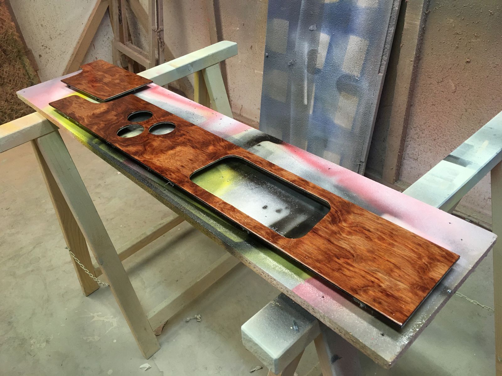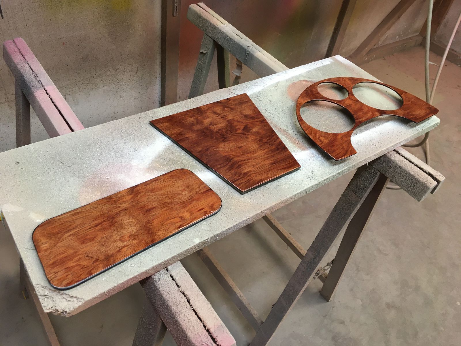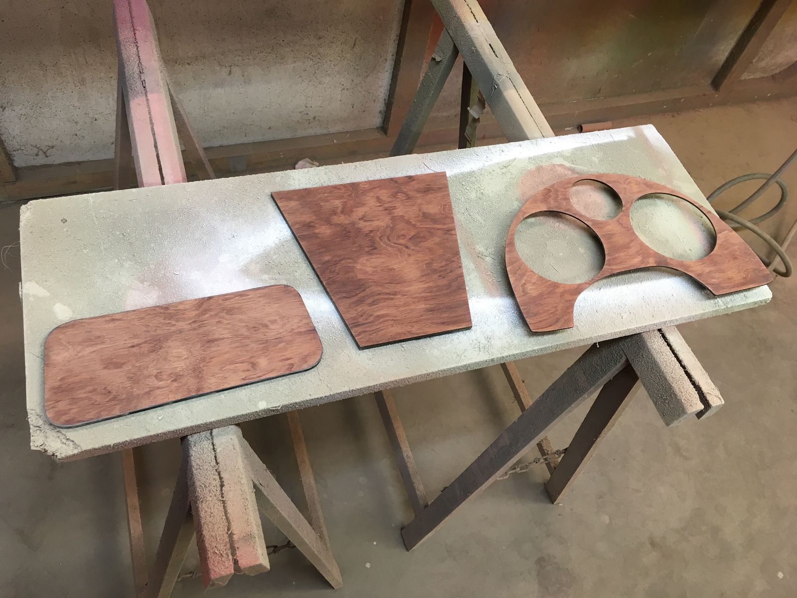 Aber es wäre kein klassisches englisches Sportwägelchen ohne Holzarmaturenbrett - also schnell ein paar seit unzähligen Jahren herumliegende Reste Bubinga-Furnier zugeschnitten, aufkaschiert und verschliffen.