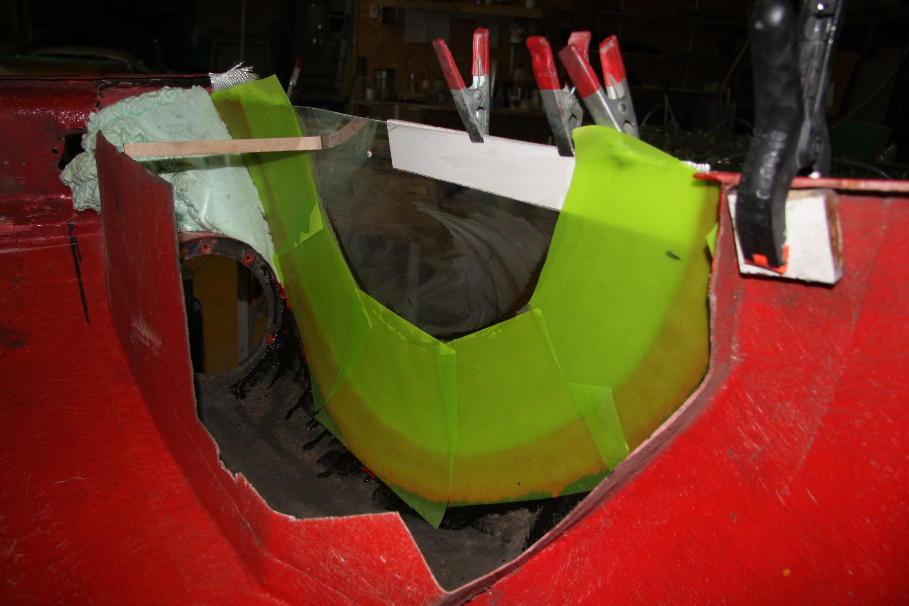 Die anlaminierten Verbreiterungen für 13" Räder war weder optisch noch vom Radausschnitt her nach meinem Geschmack. Also wurden diese entfernt und der Kotflügel verlängert um dann später, für schmale 10" Räder, passende Ausschnitte zu machen. Dabei hat sich als formgebendes Material das sogenannte "Rollglas" aus dem Baumarkt bestens bewährt.