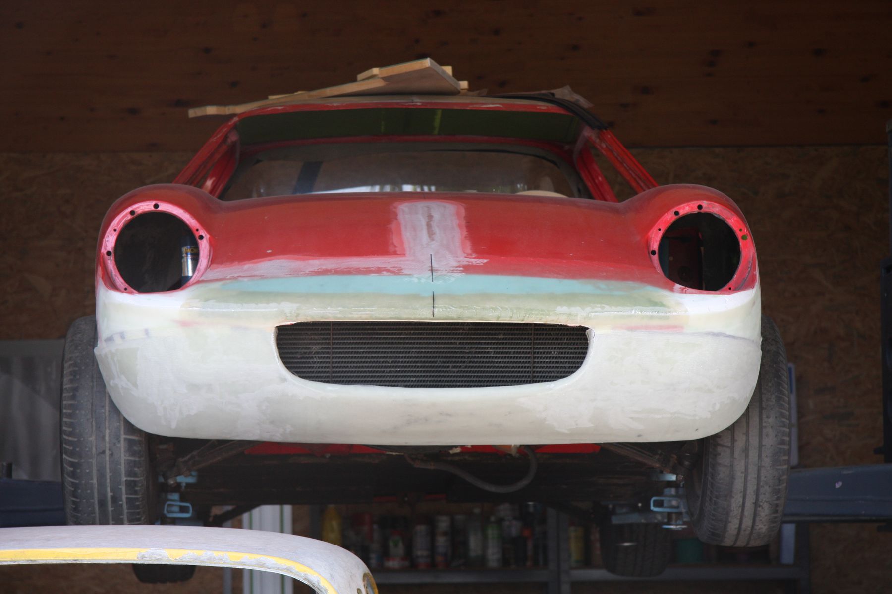 Da ich mich mit dem unteren Teil der Front einfach nicht anfreunden konnte, einmal kurz an einer Lotus Elan Karosse die Frontschürze gemessen und für gut befunden. Ein paar Stunden Laminierarbeit später war dann die Frontschürze am GTM dran. Noch etwas Feinarbeit bei der Ausrichtung und den Übergängen, vor allem auch im Bereich des Lufteinlasses, dann wird das vollends.