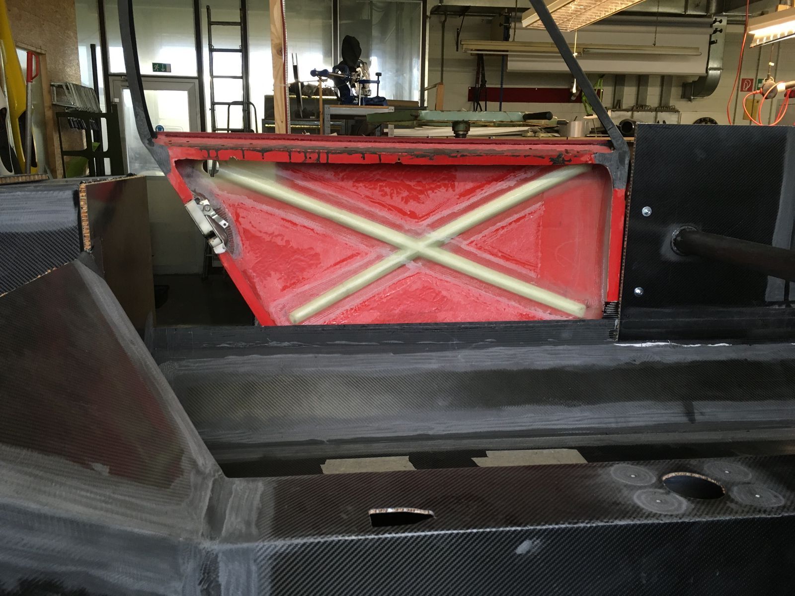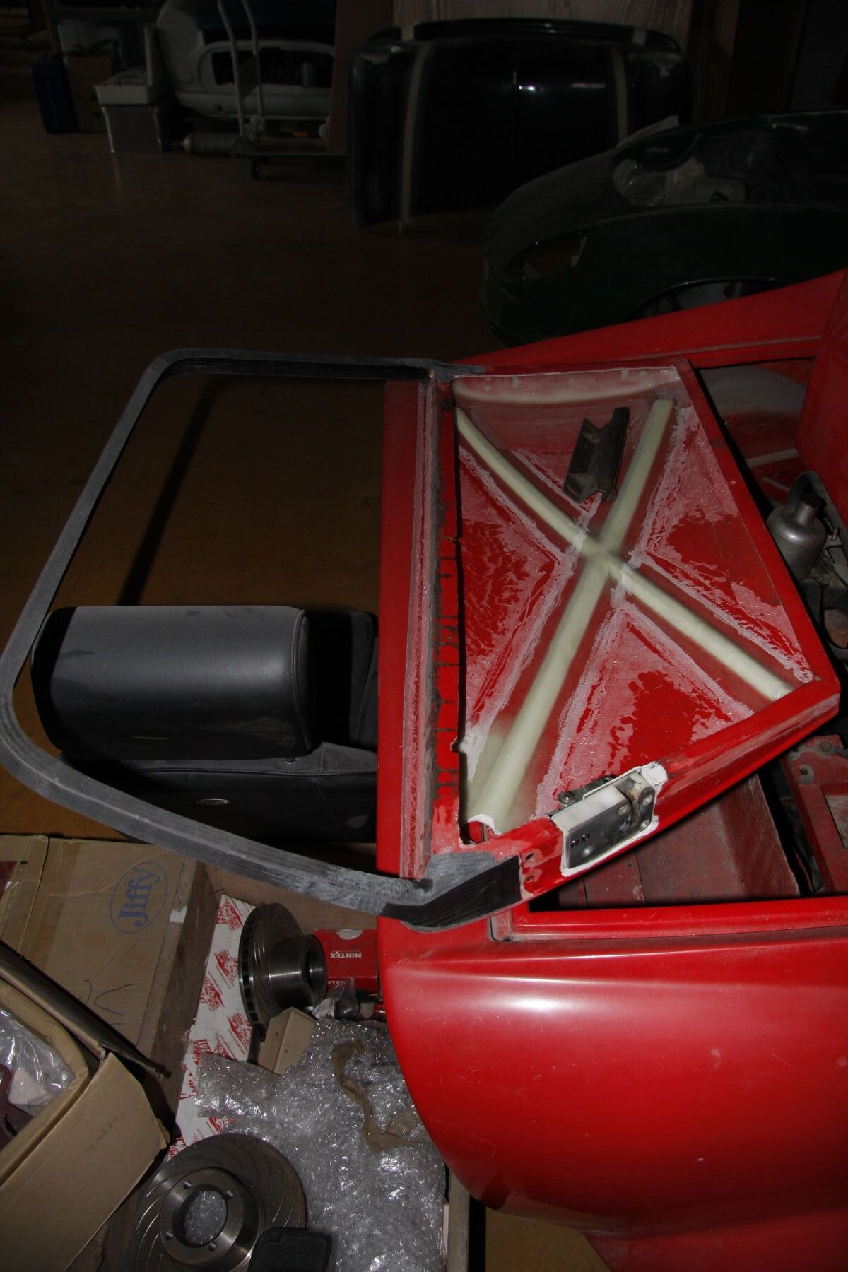 Die im Normalfall mit der Tür verschraubten Fensterrahmen aus Metall hatten mir nicht nur wegen ihrer nicht zum Tür-Ausschnitt in der Karosserie passenden Form von Anfang an nicht gefallen. Also schnell eine provisorische Form für den Fensterrahmen gebaut und zwei Fensterrahmen aus Kohlefaser gebaut. Nach dem genauen Ausrichten an der Tür wurden die neuen Fensterrahmen fixiert und anlaminiert. In diesem Zuge wurden diverse Stahlblechteile aus der Türe entfernt. Diese neigen im Laufe der Zeit nur zum rosten und bringen weitere unangenehme Folgeerscheinungen mit sich. Alles wofür sie gedacht waren lässt sich auch auf anderem Weg wesentlich leganter und materialgerechter realisieren.