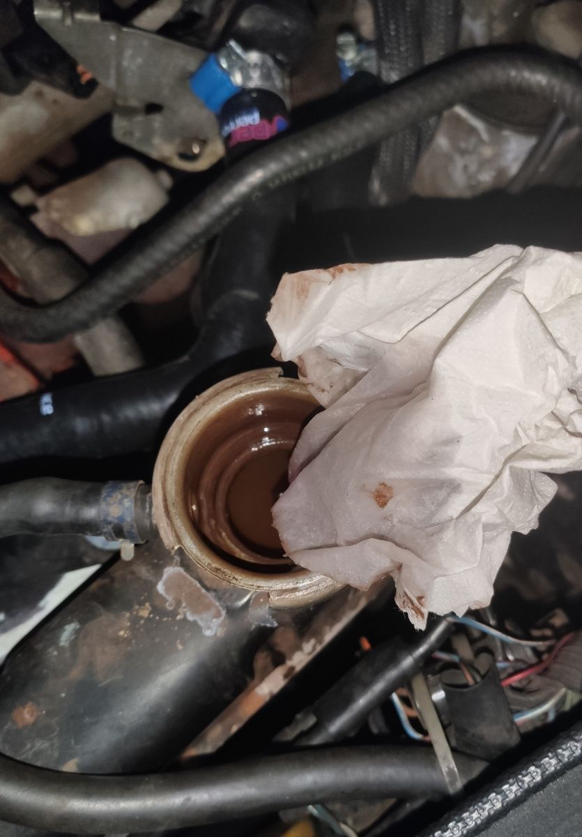 Bei meinem 96' SPI habe ich wegen einem kaputten Schlauch gleich die meisten Schläuche des Kühlwasserkreislaufes wechseln lassen. Dabei wurde natürlich auch das Kühlwasser gewechselt, so viel ich weiss der ganze Kreislauf, nicht nur der Kühler. Nun nach ca. 50 km Fahrt ist es wieder komplett braun (siehe Foto).