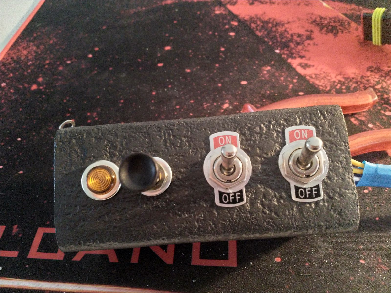 Die On Off Blende ist aus dünnem Alu, hab ich in der Bucht mit kompletten Schaltern gekauft, dann etwas aufgefeilt und angeklebt.