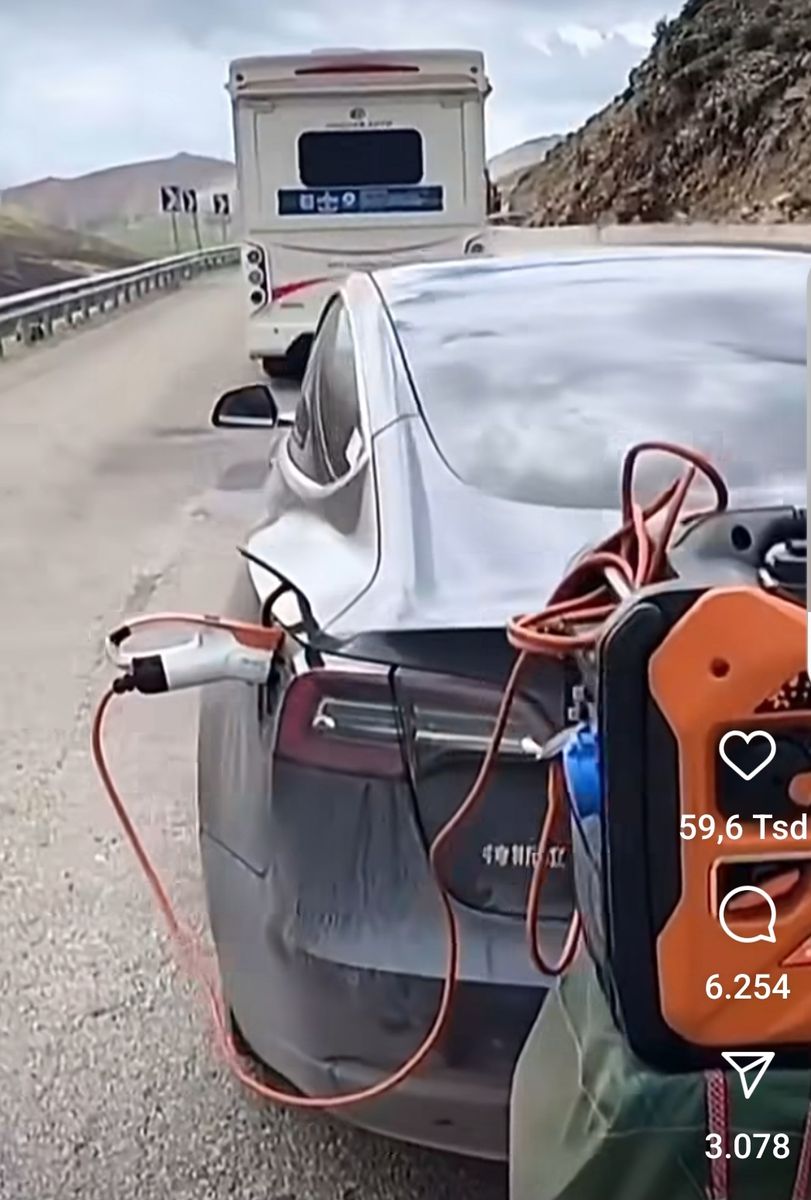 Das stimmt nicht. Du kannst mit Stecker drin nicht starten. Bist Du aber im Fahrmodus kann der Beifahrer den Stecker einstecken und tatsächlich mit einem Aggregat den Akku während der Fahrt laden.