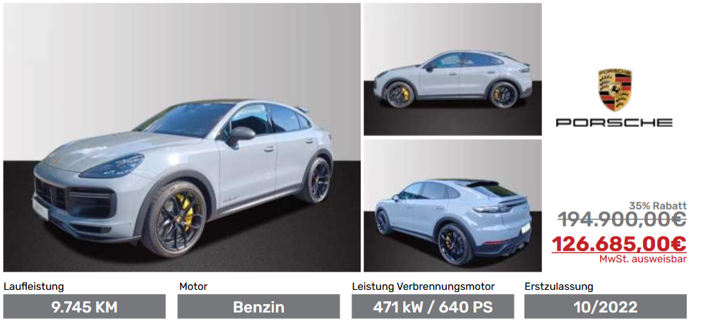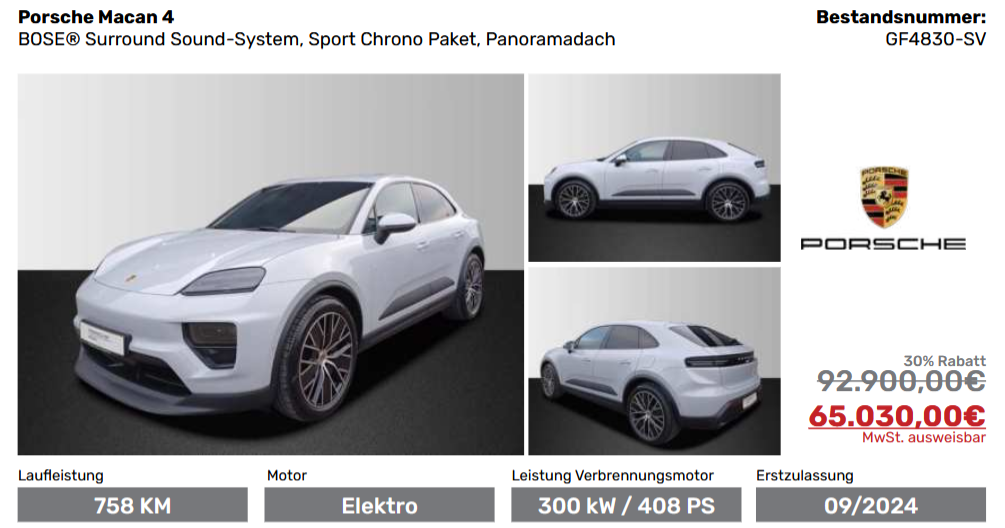 Ansonsten sehe ich den Punkt nicht, bei den Laufleistungen ist es herzlich egal ob da nun 1000 oder 10000km steht was den Endpreis angeht. Den Verbrenner gibt es nicht mehr neu und damit bleibt Verbrennerfreunden (Ja, bei Porsche würde ich mehr klar für einen Verbrenner entscheiden) nichts anderes übrig als einen gebrauchten zu nehmen, was die Preise von fast neuen Autos zwangsweise oben hält.