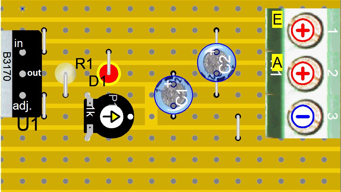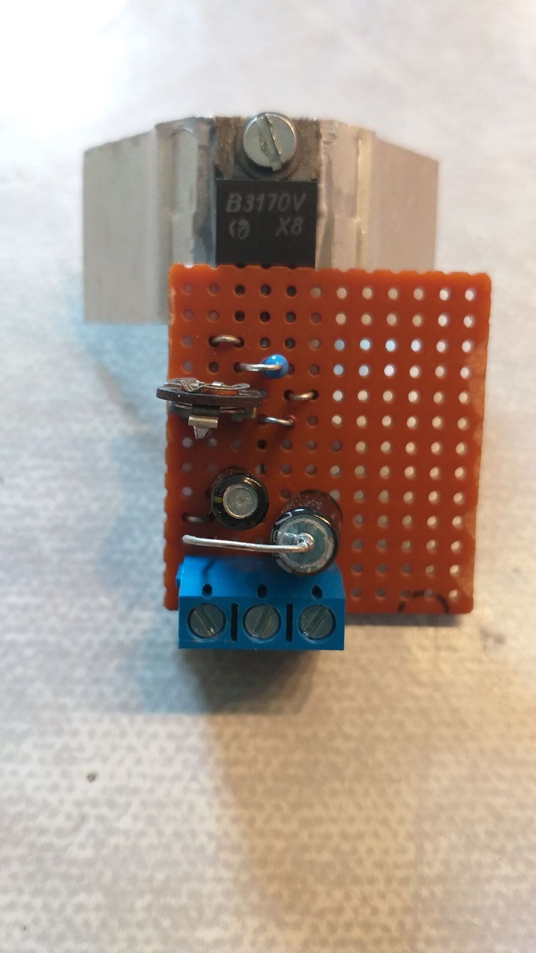 Zum Einsatz kam ein B3170 (LM317) als einstellbarer Spannungsregler auf einer Lochrasterplatine mit einem kleinen Kühlkörper.