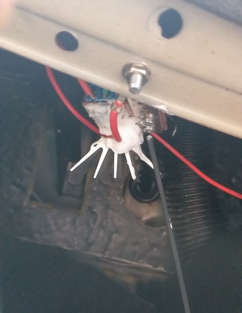 Die Lochrasterplatine mit den Bauteilen für die (einstellbare) 5V Beleuchtungsspannung ist recht kompakt und findet unterm Armaturenbrett Platz. Wichtig ist, die Bauteile gegen Abvibrieren mit etwas Silikon zu befestigen.