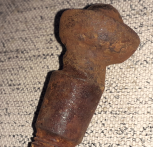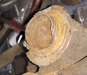 Bolzen (mach beachte die herausgearbeitete Kerbe) hatte sich schon mehr als 5...6mm aus seiner Mittelposition wegbewegt, entsprechend ist das Gewinde am Achsschenkel und der Mutter einfach - weg.