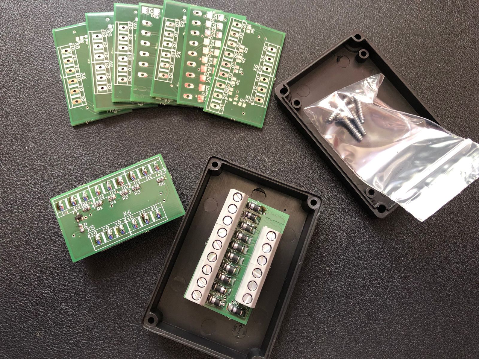 Es gibt insgesamt 9 Platinen, davon sind zwei fertig aufgebaut.