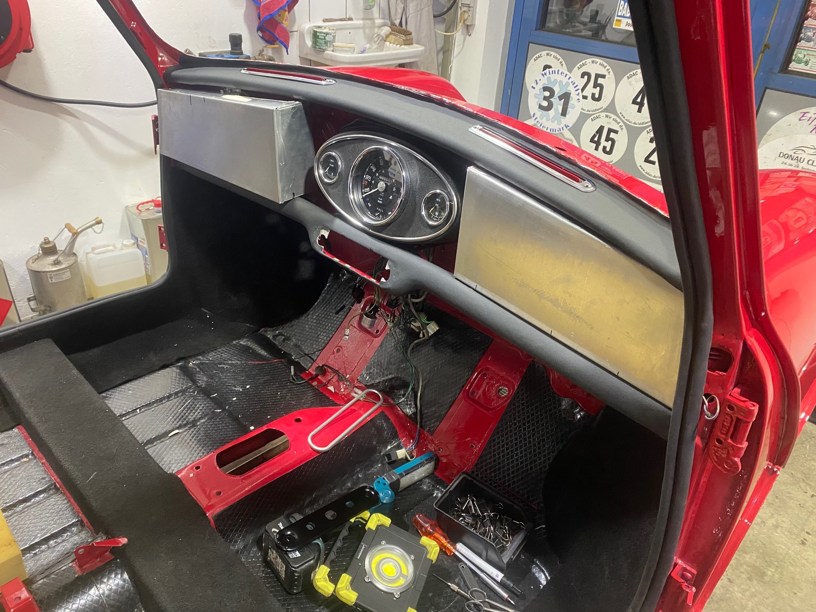 Der Sicherungskasten sitzt im Motorraum, auf der Beifahrerseite, etwa 5 cm neben der großen Öffnung zum Innenraum. Von der Mitte aus geht ein Kabelstrang, der in 8-9 Rundsteckern endet, zur Fahrerseite. Dort wird später der Kabelbaum für das Fahrzeugheck angeschlossen.