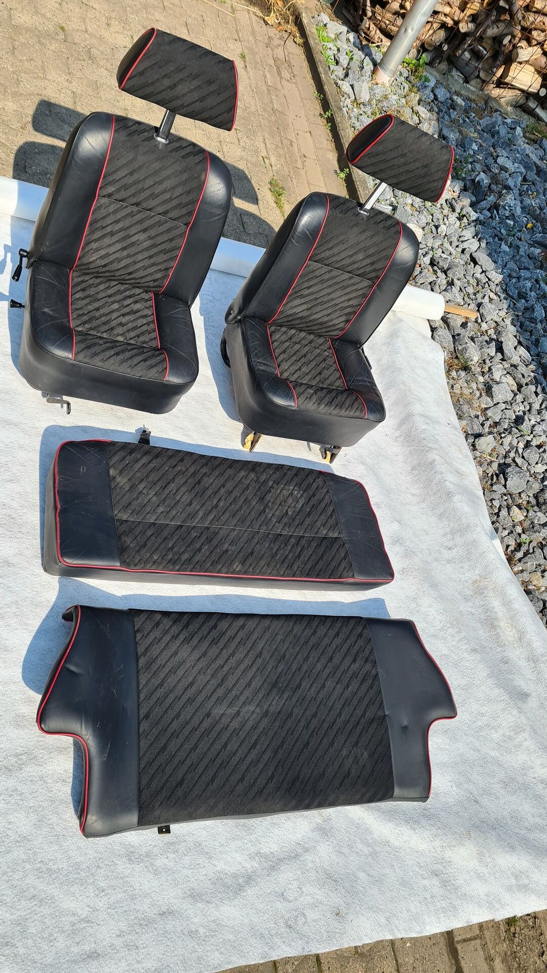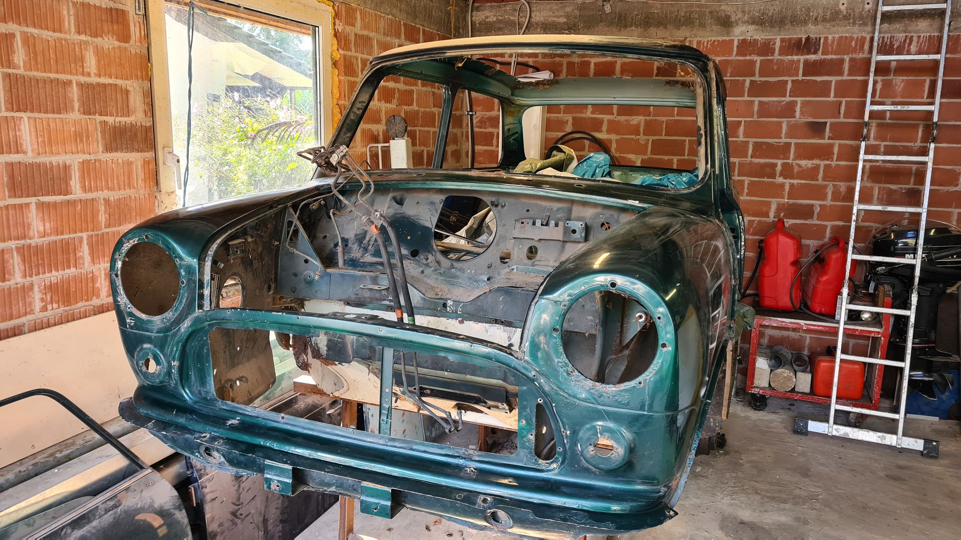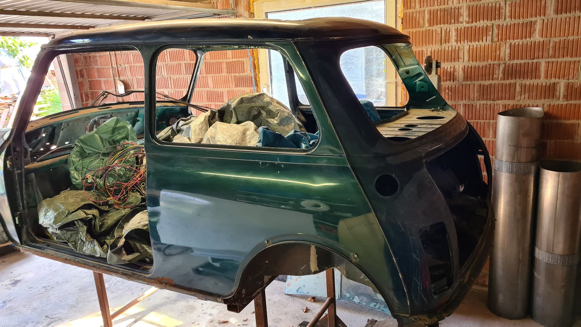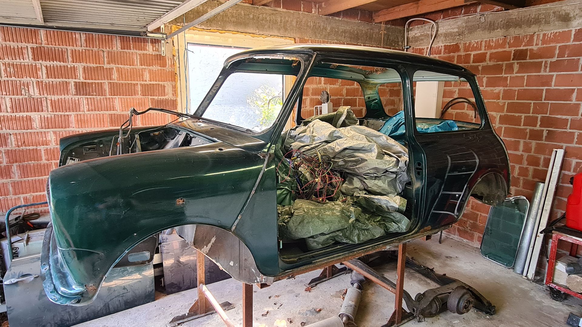 Der Cooper ist bis auf die Karosse demontiert und der Unterboden ist entfernt. Zu den Schweißarbeiten bin ich leider nicht mehr gekommen. Beide Fahrzeuge haben ein Faltdach verbaut. Die Papiere für den Cooper sind vorhanden auch ein Werkstatthandbuch in gedruckter Form ist dabei, nur der Unfallwagen hat keine Papiere. Eine Sitzganitur ist voll Leder beige, die andere Teilleder Schwarz. Teppiche in Rot und Schwarz.