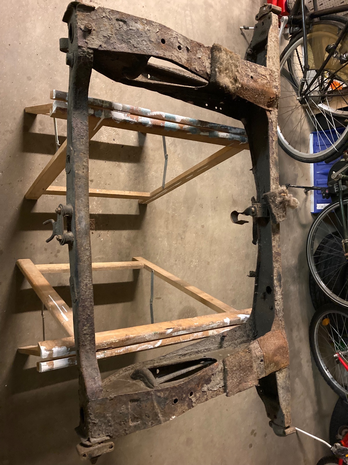 Ich verkaufe einen Hilfsrahmen. Er ist aus den 1980ziger Jahren und hat Flugrost angesetzt. Wie ihr auf dem Foto sehen könnt, ist er an einer Stelle geschweißt worden.