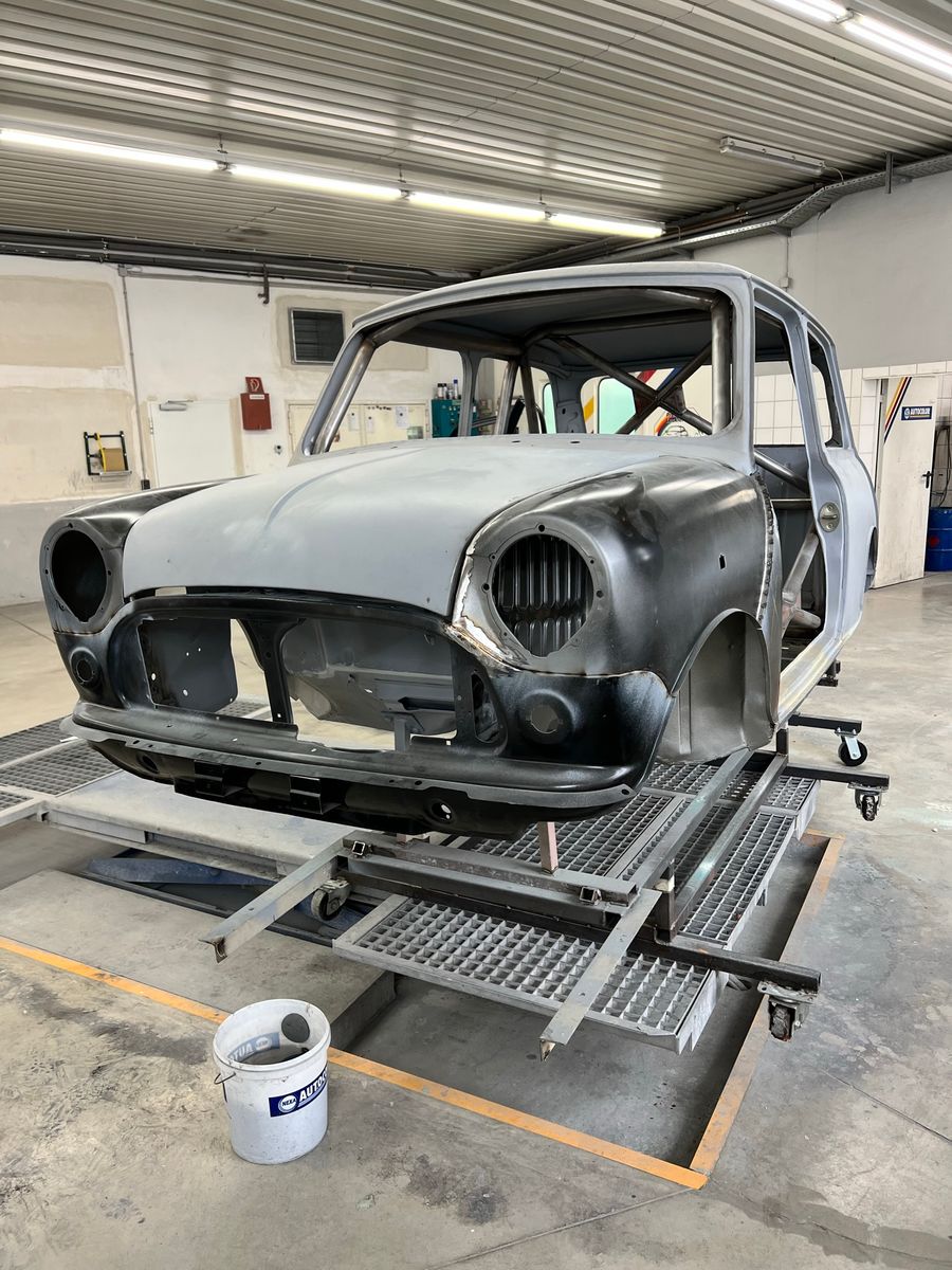 Liebe Minigemeinde, nachdem mein Mini im Entlackungsbad war, viele neue Blechsteile bekommen hat und nun fertig durchgeschweißt ist, wird die Karosse in den nächsten 14 Tage fertig lackiert.