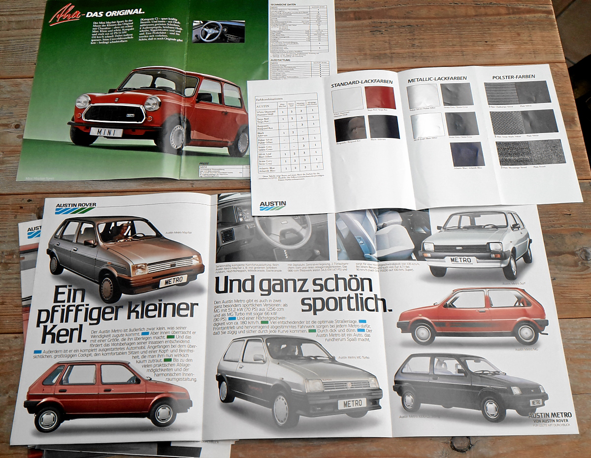 9) 8-seitiger Prospekt „Austin 88 – die Autos mit Aha-Erlebnis“, Mini, Metro und Montego Kombi, deutsch, incl. separater Farbkarte guter Zustand