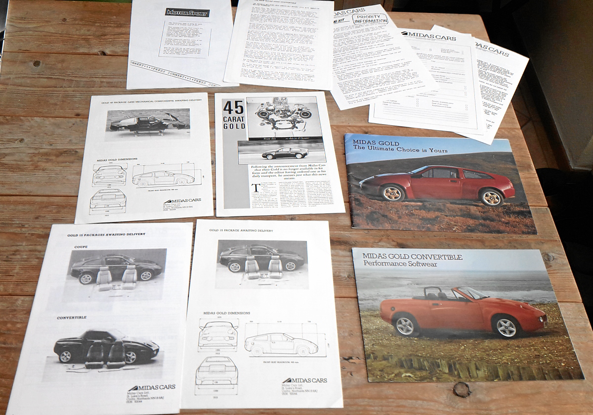 1) extrem seltenes komplettes Unterlagenpaket (englisch) „Midas Gold“, bestehend aus je einem 4-seitigen Farb-Faltblatt für die Coupé-Variante und für das Cabrio. Dazu eine große Menge schwarz/weiße Unterlagen wie Datenblätter, Bestellformulare, Presseberichte und und und…. Alles in hervorragendem Zustand.