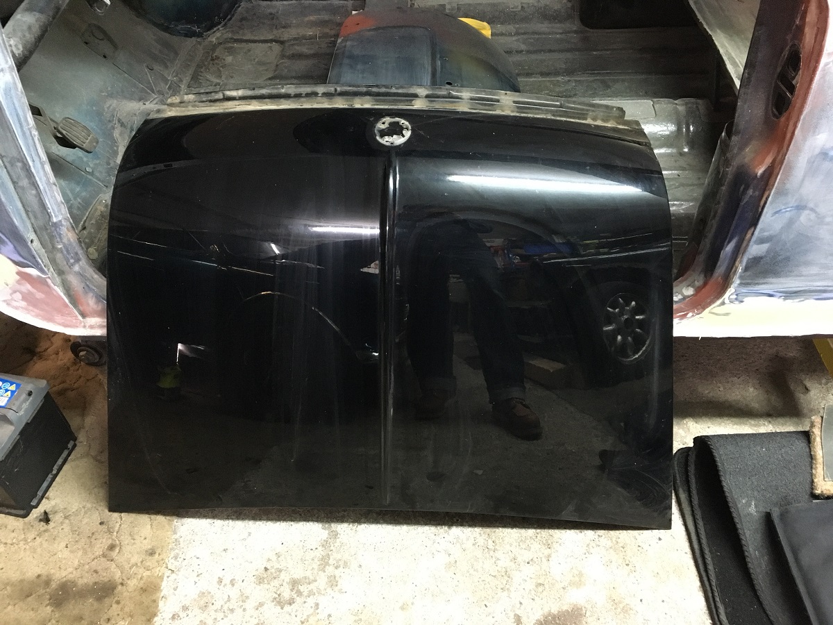 Motorhaube, schwarz, eine kleine Delle und eine kleine Beule, doof zu fotografieren: 50€