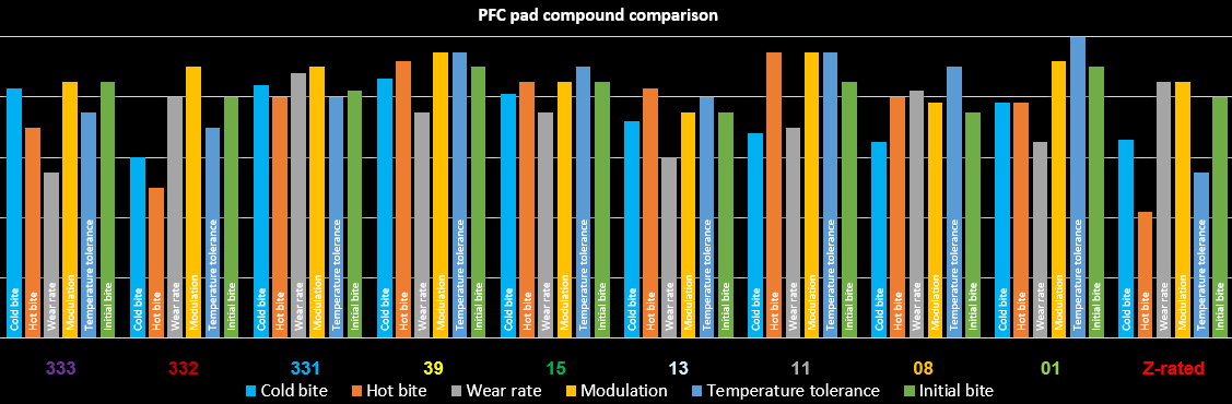 Ich hab in der Zwischenzeit ein wenig geforscht. Der Carbon Metallic Belag für die Cooper S Bremse wird von Performance Friction (PFC) gemacht und dürfte die 01er Mischung sein.
