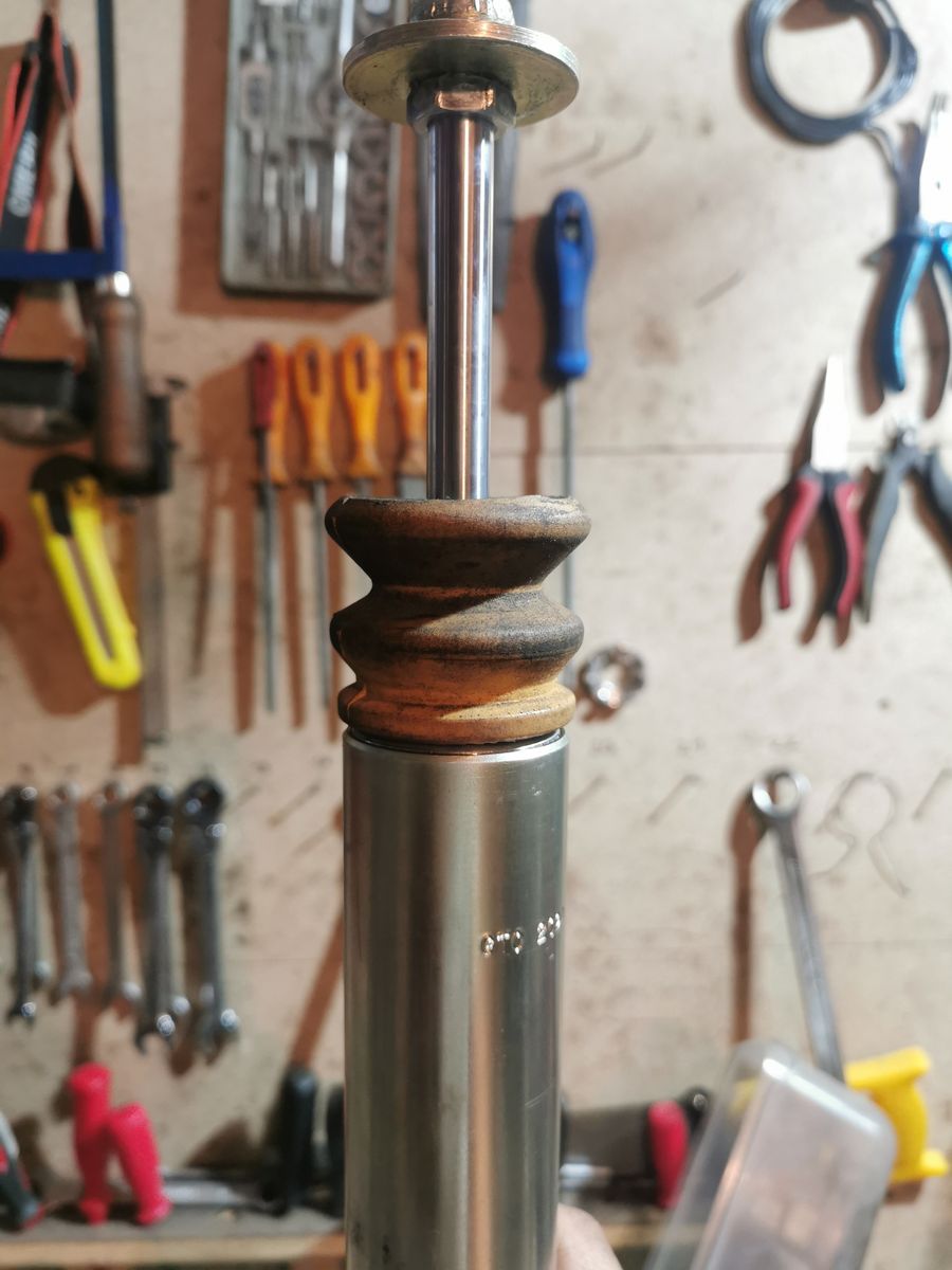 Also zurück auf Los. Neue Bremstrommeln bestellt, und dieses Mal werde ich den Einfederweg kürzen. Zu diesem Zweck habe ich mir Distanzscheiben aus Gummi in 5, 10 und 15 mm Stärke gekauft. Wenn man diese schlitzt, kann man sie ohne Werkzeug auf die Kolbenstange stecken und so schnell mit der idealen Länge experimentieren. Von anderen Autos kenne ich das, um das Handling feinzutunen, weil die Bump Stops früher bzw. später Kontakt haben.