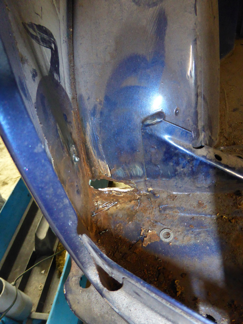 • vorn rechts gabs wohl mal nen Treffer, der Kotflügel wurde ausgebeult und ist dabei gerissen, Frontschürze ist etwas verbeult