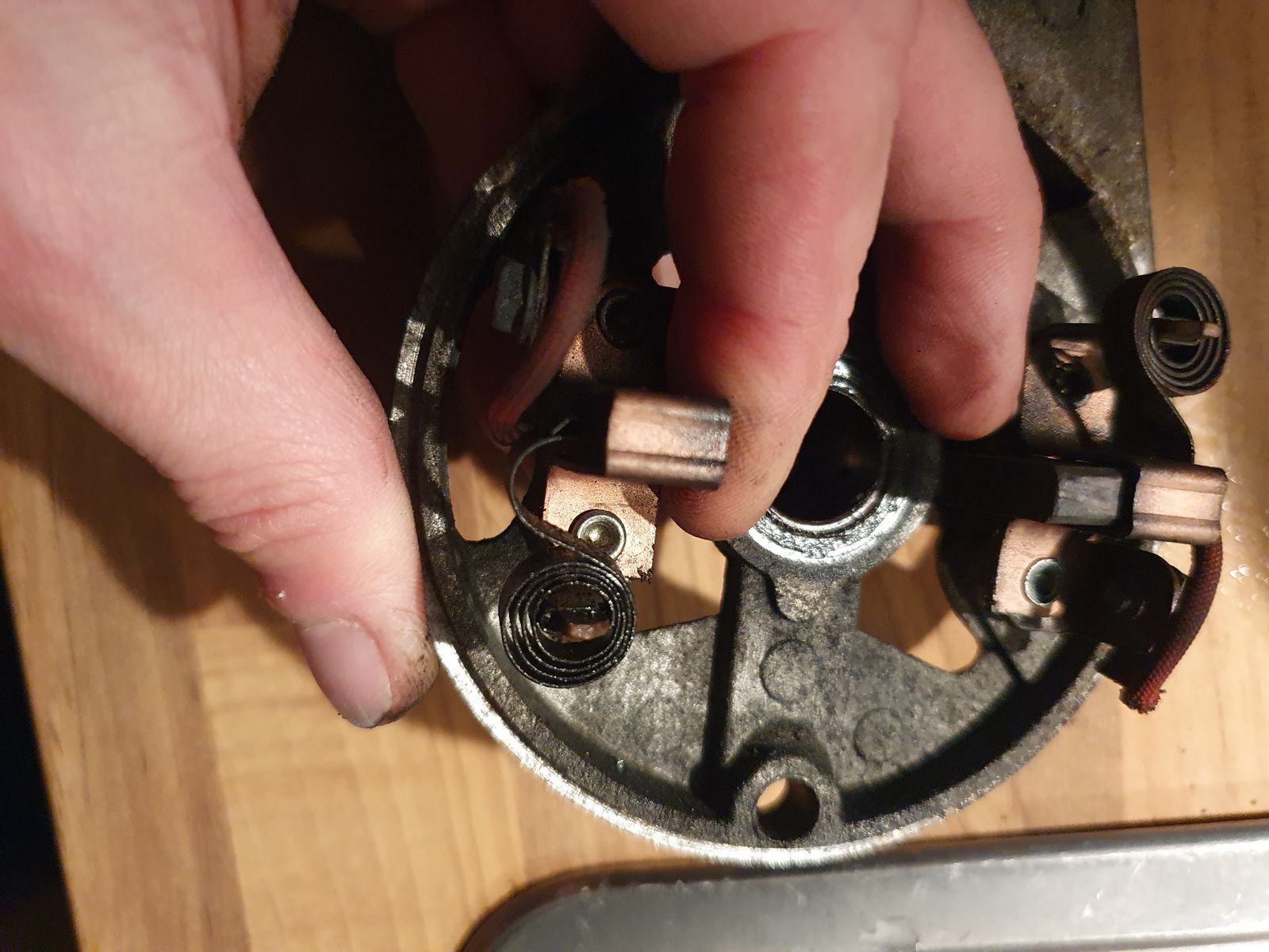Die Kohlen sind noch so breit wie die messingfarbene Führung. Das sieht schmaler aus als auf dem Foto oben. Die Federn sind recht stramm😉. Kann es daher sein, dass die Kohlen zu lasch am Drehkern Aanliegen?
