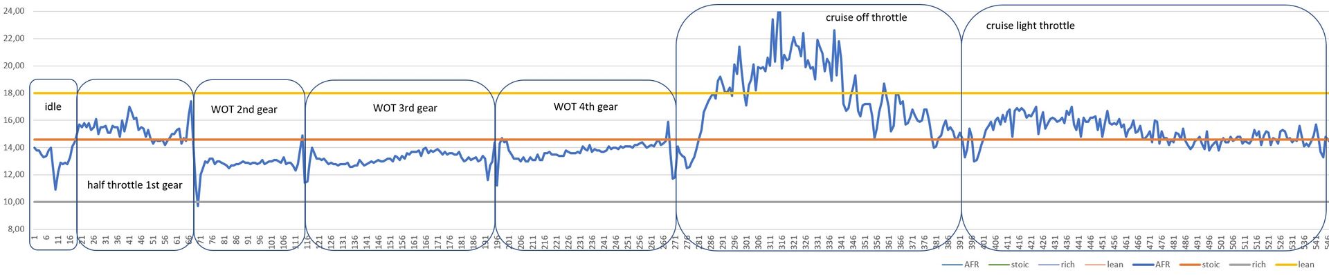 ich habe bei meinem Mini ein AEM AFR mit der Möglichkeit zum Dataloggen verbaut und nach absolvierter Einfahrphase gestern mal einen Testlauf gemacht. Der Motor zieht super durch, meiner Meinung nach sieht das Diagramm auch ganz gut aus, was meint Ihr?