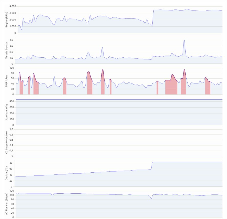 Danke für Deinen Hinweis. Ich habe noch zwei Bilder angefügt- später von der gleichen Testfahrt (wärmerer Motor). Hier sieht man den Stepper doch am arbeiten. Ob das dieses Verhalten normal ist kann ich nicht beurteilen.