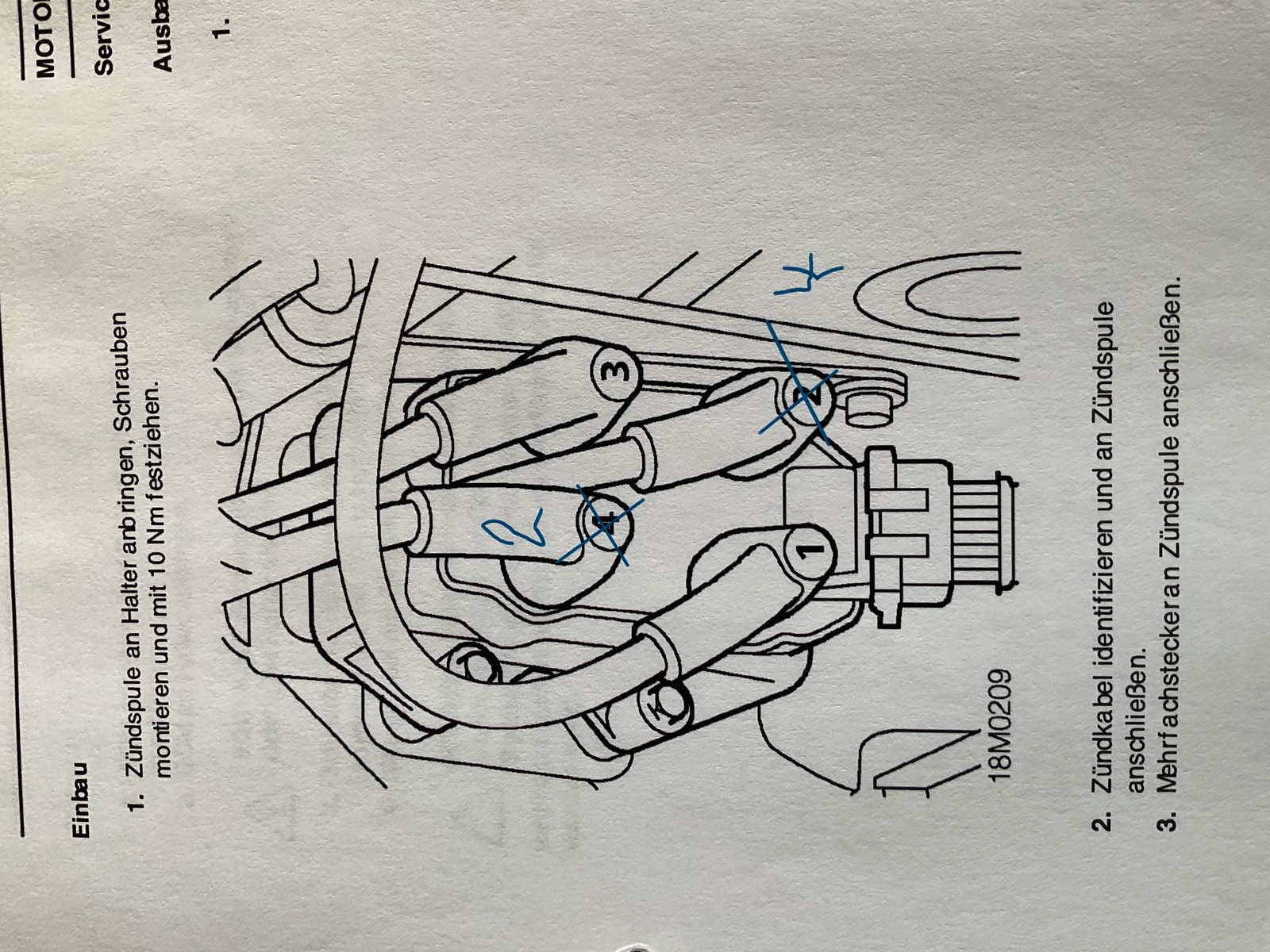 • Ja, die Zündkabel stecken so auf der Zündspule und gehen dann mit der 1 auf die Wasserpumpenseite (Motoreingang) zur Kupplungsseite (Motorausgang).