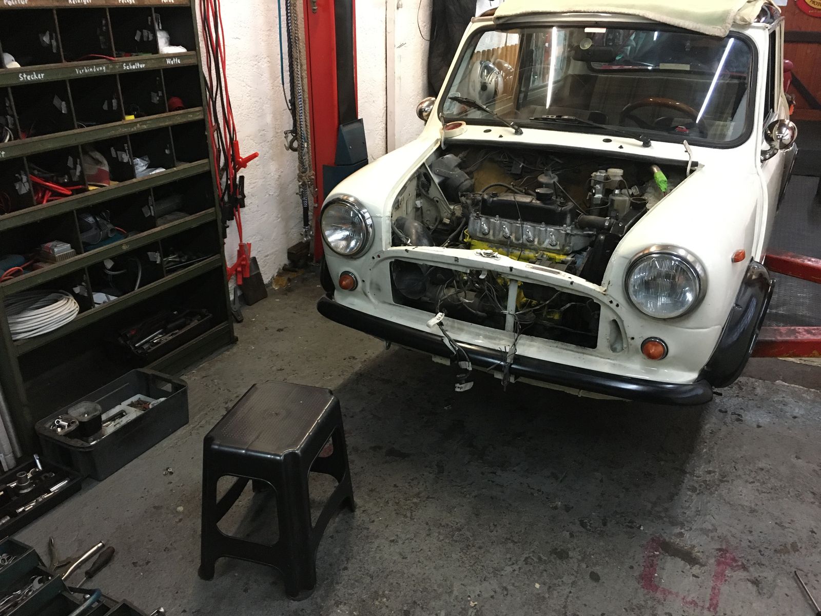 Meine innige Leidenschaft ist schon seit vielen Jahrzehnten die Oldtimerei. Meinem aktuellen Bestand, bestehend aus 6 Autos und 4 Motorrädern, habe ich spontan am Anfang dieses Jahres einen 1983er Mini zugefügt (der nimmt ja kaum Platz weg). Das war überhaupt nicht geplant, aber wie das Leben so spielt: Sonntags bei einem Besuch in der Motorworld Köln gesehen, montags gekauft, dienstags abgeholt und mittwochs schon einen Dauerparkplatz auf der Hebebühne eingerichtet.