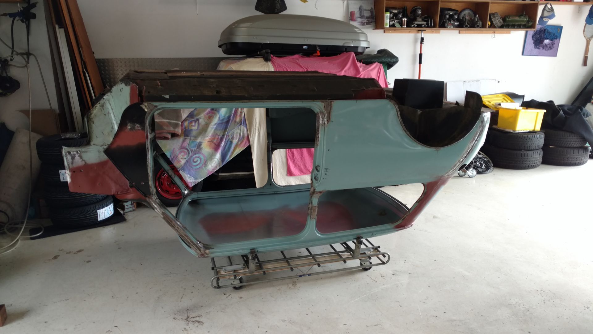 Ich würde am liebsten versuchen die Karosse auf die Seite zu legen, so könnte ich schön ohne Verrenkungen alles lackieren und danach die Brems- und Benzinleitungen verlegen.