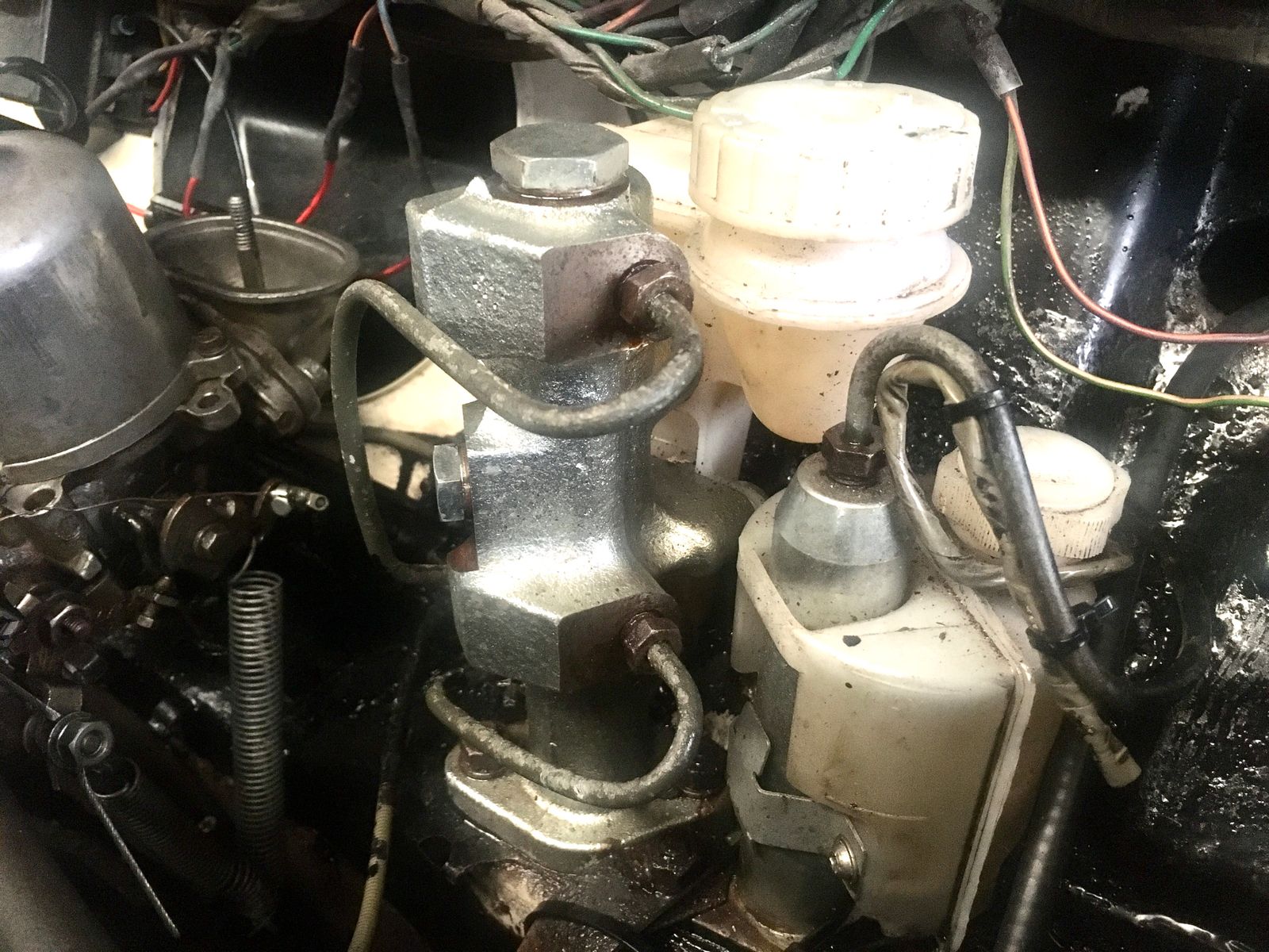 Die Bremsanlage ist nach meinem Eindruck vor nicht allzu langer Zeit überholt worden: Der HBZ ist neu (siehe Bild), die vorderen Bremsschläuche auch, die Beläge sehen rundum aus wie gerade aus der Verpackung und die Trommeln sind nicht erkennbar eingelaufen. Hinten hat man dagegen außer neuen Belägen nix gemacht, da musste ich halt ran (Bremsleitungen, Verteiler und Schläuche ausgewechselt).