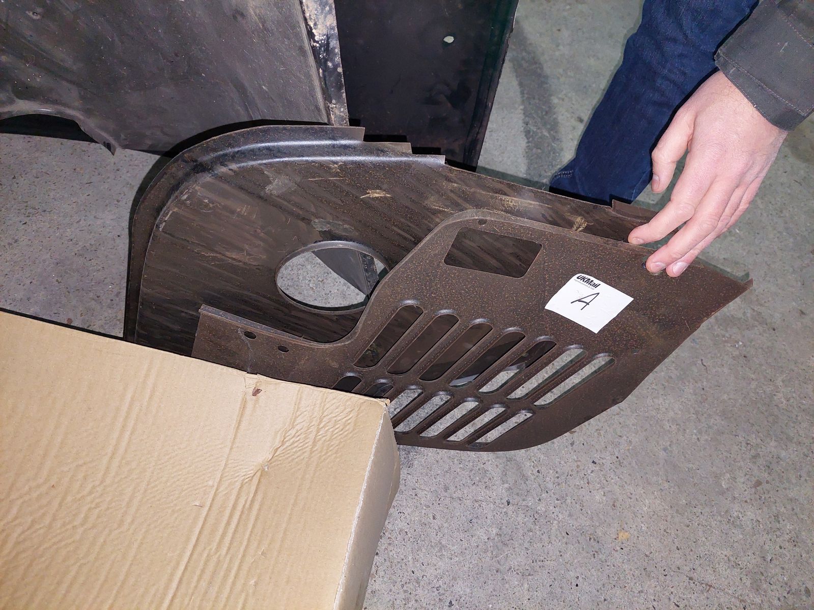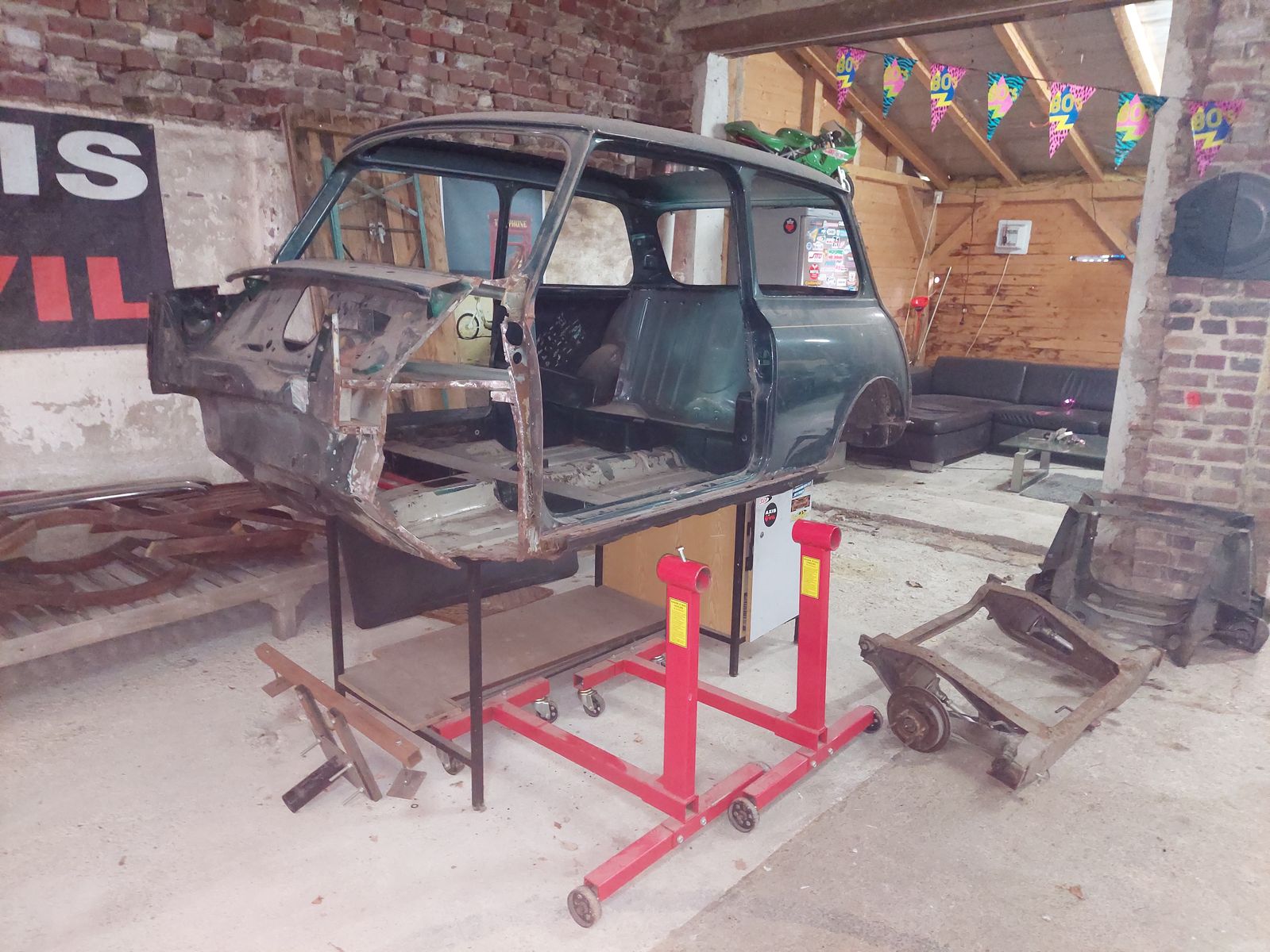 Die Karosserie wurde auf eine Drehvorrichtung aufgeschraubt und einige der Rostbefallenen Bleche schon herausgetrennt.
