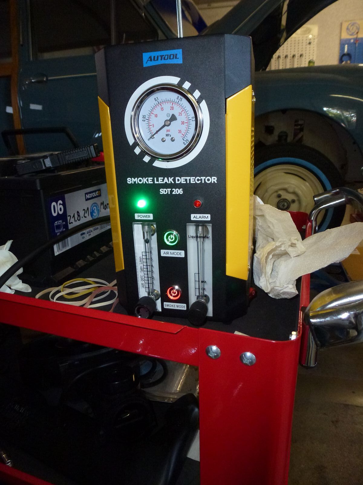 jetzt will ich kurz über meine Erfahrungen mit der Ursache der Drehzahlschwankungen bei meinem 91er Mini berichten: Im Hinblick auf die von Norman vermutete Ursache DKW habe ich mir einen sog. Smoker gekauft (siehe Oldtimer Markt Heft 2/2023). Mit diesem probaten Rauchgenerator (siehe Foto) kann man versteckten Falschluftquellen auf die Spur kommen - wichtig bei Vergaser wie auch Einspritzern. Das Gerät funktioniert perfekt. Luftfilter abbauen und über den Vergaserflansch zum Luftfilter ein Gummihandschuh dicht drübergezogen, ein Finger luftdicht mit dem Schlauch des Geräts mit Tape verbunden, Kurbelgehäuseentlüftung luftdicht zugeklebt und Gerät angeschaltet. Der Rauch kam -erwartungsgemäß- zuerst aus dem Leerlaufabstellventil. Also Zündung an und...sofort war das Ventil rauchdicht = das Leerlaufabstellventil arbeitet korrekt. Also weiter mit der Taschenlampe nach einer Rauchfahne geschaut... und siehe da, aus der DKW-Lagerung am Gaszug zog seelenruhig eine Rauchfahne hoch. Die erfahrungsgestützte Vermutung, dass die Simmerringe der DKW ihrer Dichtfunktion nicht mehr nachkommen, war richtig. Im Spätherbst, wenn ich den Mini über den Winter einmotte, wird der HIF überholt und die WDR´e erneuert. Nochmals besten Dank an die Chat-Teilnehmer.