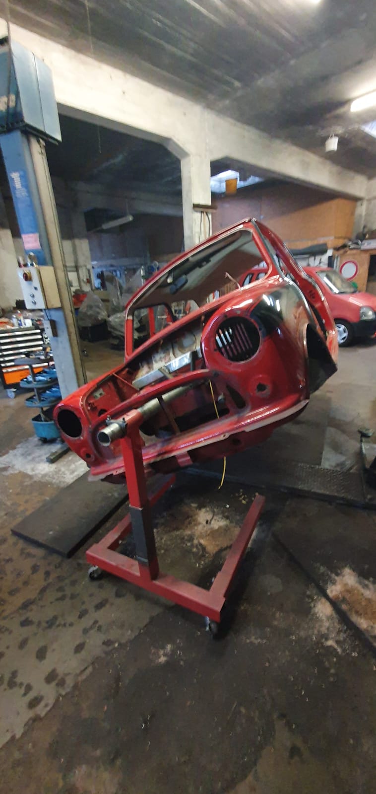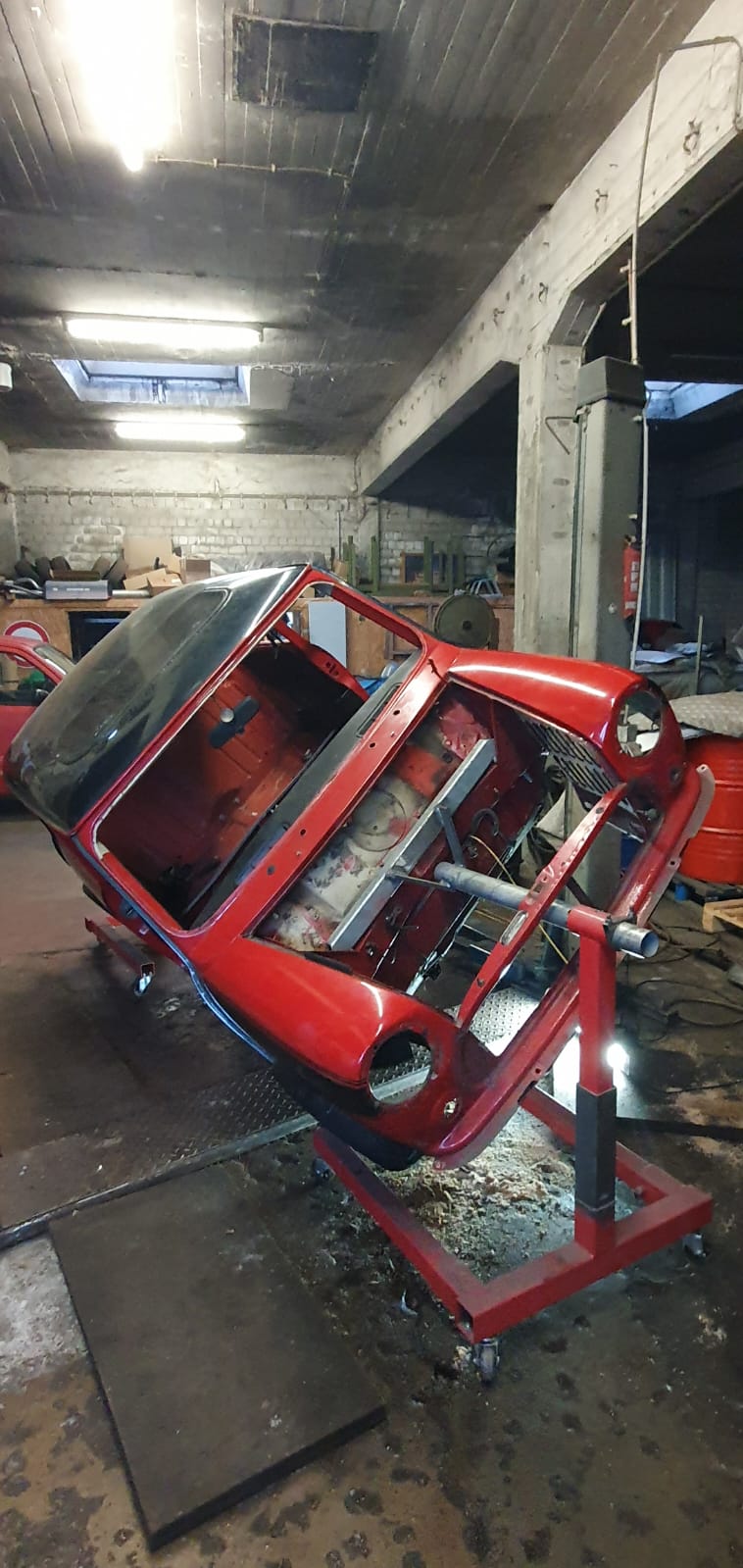 Aber nicht immer lässt sich dieses Anschlaggummi so einfach abschrauben, vor allem wenns dort ziemlich verostet ist. Beim Freund mit der Hebebühne ist es am einfachsten. Auto hoch heben, dann seinen passenden Wingertspfahl unter den oberen Querlenker klemmen und Hebebühne etwas absenken. Alles um dann in Augenhöhe zu arbeiten. So macht er das seit über 50 Jahren in seiner Miniwerkstatt.