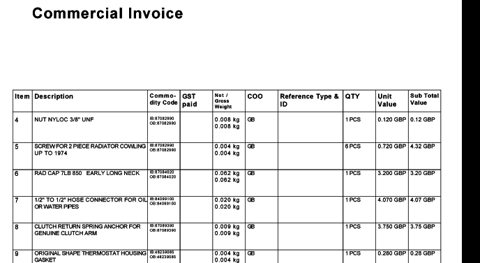 • Ist mir aus den Unterlagen nicht ersichtlich.Es gibt ein Blatt das Commercial Invoice betitelt ist, da werden alle Artikel (20) in einer Tabelle aufgelistet.Da steht zB unter COO jeweils GB, ob damit das Ursprungsland gemeint ist weiss ich nicht.