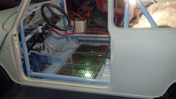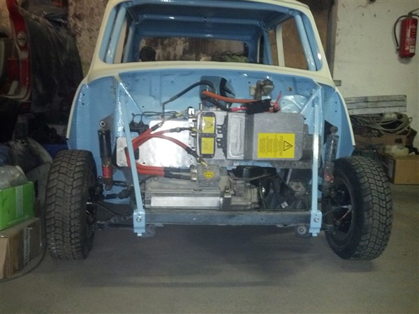 Umbau #1 gibt es schon. Ist zugelassen seit April 2019 mit E-Kennzeichen. Ist ein 84er (10"), hat jetzt 27kW und 660kg, davon 90kg für die Batterie (16kWh). Motor, Getriebe (feste Untersetzung und Differential) und Regler stammen aus einem norwegischen E-Auto namens Th!nk (schreibt sich wirklich so), das ich ausgeschlachtet, und die Teile dann in den Mini reingebaut habe. Das einzig Neue sind die Batterien. Projektlaufzeit incl. Karosse instandsetzen über 4 Jahre.