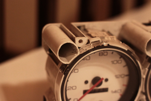 Der Tacho war in einem Holzamarturenbrett verbaut und dafür mussten ganz fachmännisch die "Kanäle" für die Blinkerleuchten gekürzt werden, siehe Bilder!