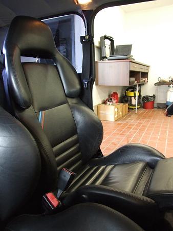 Nach reichlich langen Überlegungen nach der passenden Sitzwahl, bin ich auf dieses Gestühl gestossen. Warum? Ganz einfach: Leder, klappbar, einfache Konsole, an den Schultern nicht zu breit, wunderschön, ca.1000 Verstellmöglichkeiten, tiefe Sitzposition und ganz wichtig: sie sind SAUBEQUEM!!! Hinter der Quertraverse einfach ein Winkelprofil für die passende Sitzposition befestigt, darauf die BMW-Konsole und schon sind se drinne. An der B-Säule und in der Mitte ist auch noch ausreichend Platz, und die BMW-Gurte passen auch noch