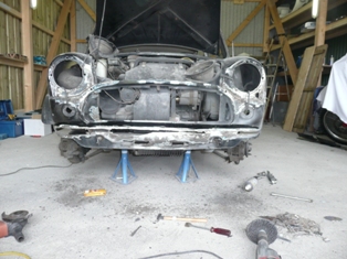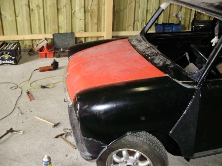 Neue Kotflügel, Maske, Dreiecksbleche, Motorhaube sind verbaut. Der Scheibenrahmen hinteres li Fenster ist wieder fit und das Heck ist rund.