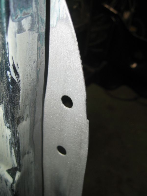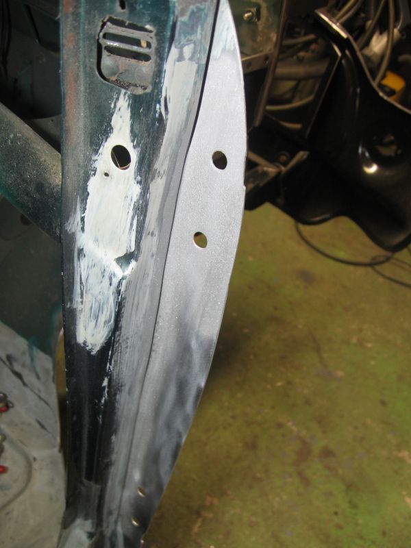 Nach dem Abnehmen der Kotflügel sieht man, dass die Kotflügel original mit 7 Schweißpunkten mit dem Windleitblech verbunden sind.