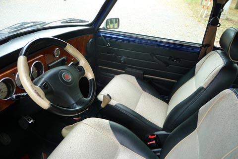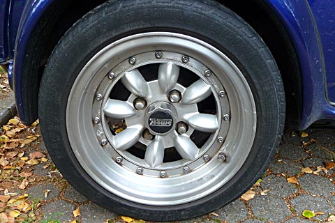 Der Innenraum ist sehr gepflegt und in gutem Zustand. Teillederausstattung in schwarz/beige, Wurzelholzarmaturenbrett. In der Heckscheibenablage sind zwei Boxen verbaut. Die bleiben beim Verkauf drin, wenn gewünscht. 13 Zoll Alufelgen.