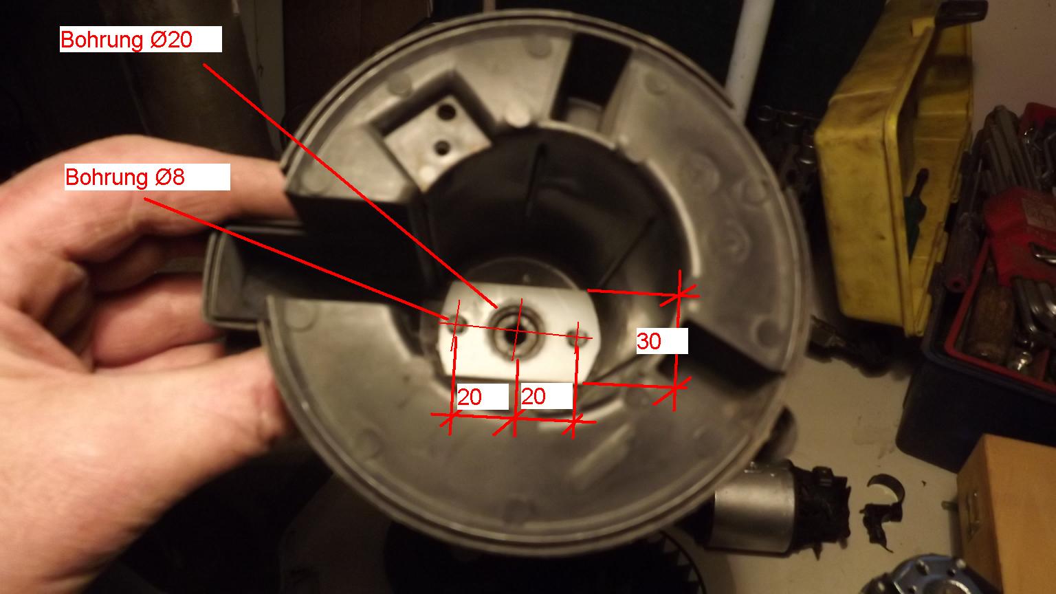 Der neue Motor kommt mit zwei Schaufelrädern, eins davon wie oben schon erlätert überflüssig. Von den Hauptabmessungen her passt der BOSCH-Motor recht gut in das SPI-Gebläsegehäuse, auch das eine der beiden Schaufelräder kann man beibehalten, muss es aber abziehen und umgedreht wieder aufsetzen, damit die Drehrichtung stimmt. Das zweite Schaufelrad wird entfernt, und die überflüssige Motorwelle wird abgeflext.