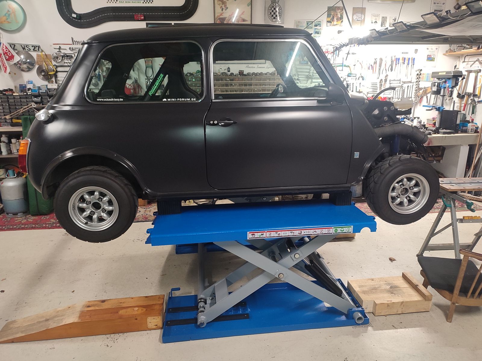 Der Mini wird also von Hand oder aus eigener Kraft auf die Holzrampen gerollt bis zum vorderen Anschlag, dann hat er automatisch seine korrekte Position.