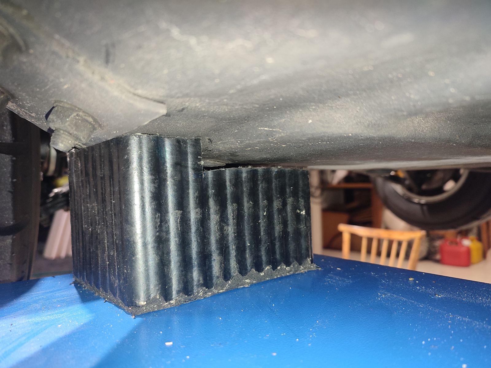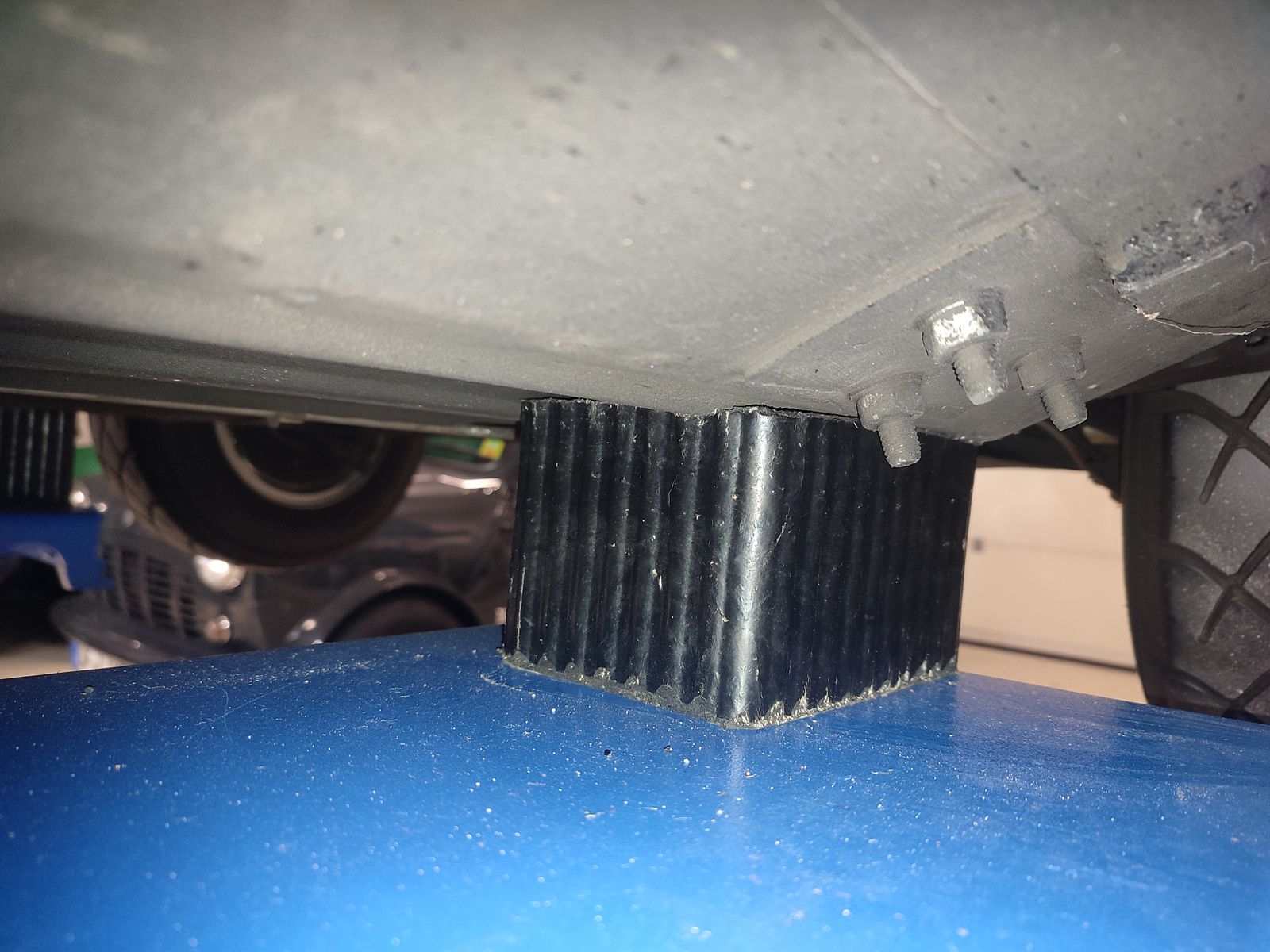 Die Aufnahmen sind Gummiblöcke in 10cm Höhe, vorn etwas ausgeschnitten, damit die Bodenwanne nicht eingedrückt wird: