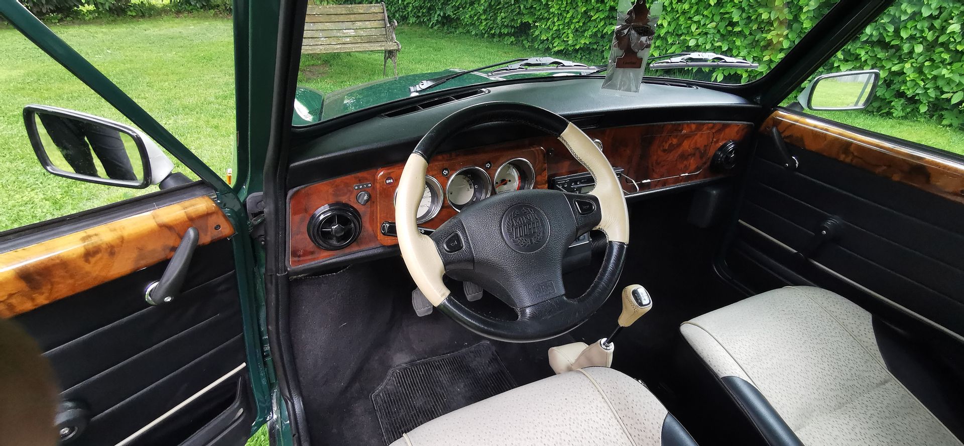 Das Wurzelholz Armaturenbrett zeigt nur minimalste Altersspuren links unterhalb des Tachos. Ebenso die seitlichen Holzstreifen unter den Fenstern sind in einem ausgezeichneten Zustand.