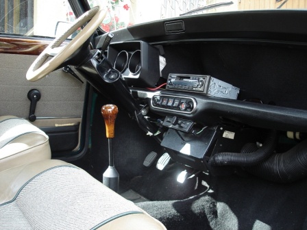 Innen ist er gepflegt, hat Teil-Ledersitze und ein Lederlenkrad in hellbeige, schwarze Teppich-Fussmatten. Der Vorbesitzer hat Wurzelholz an Türgriffen, Seitenverkleidung und Schalthebel nachgerüstet.